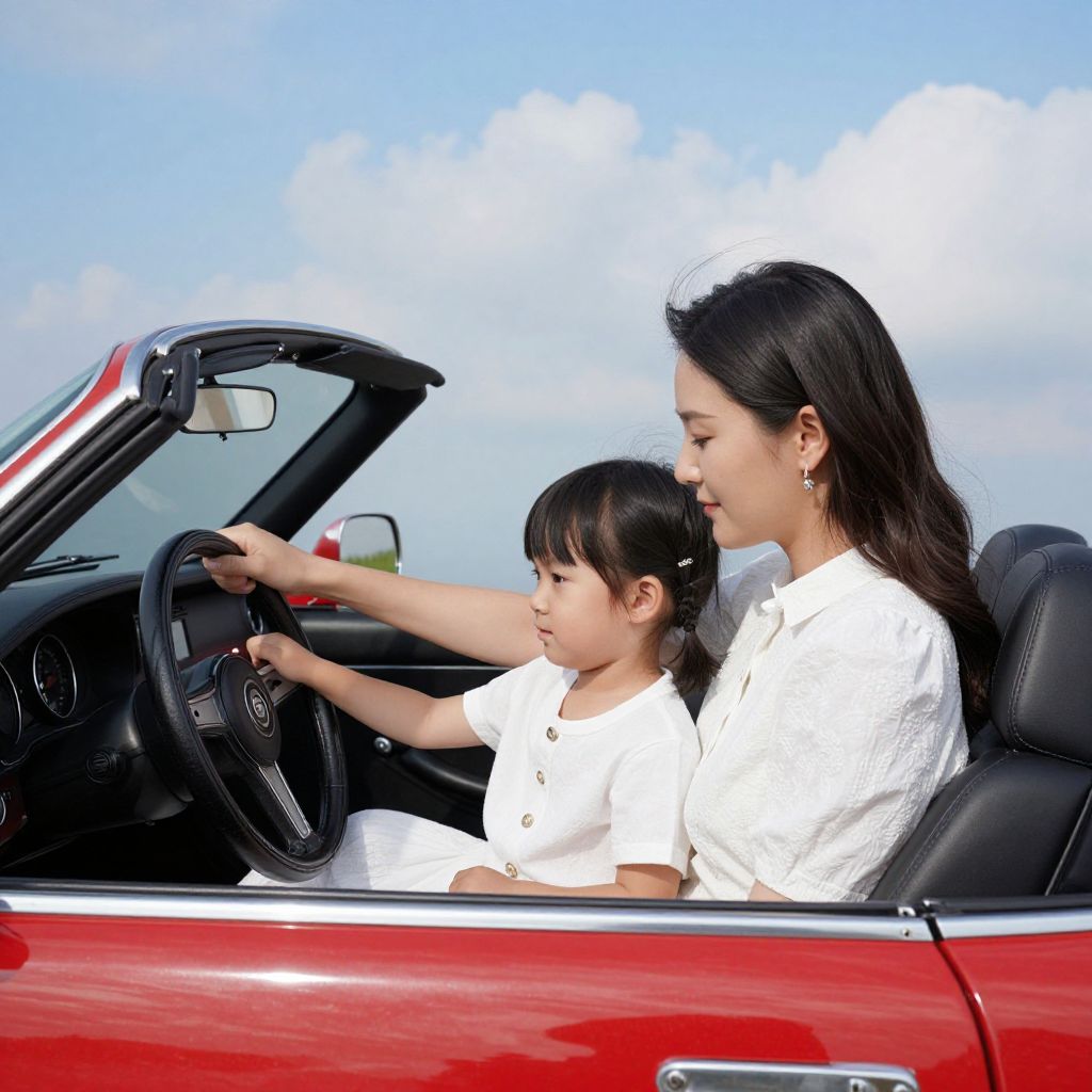 Woman and child share a tender moment inside a classic red convertible, with the woman gently guiding the steering wheel as the child sits beside her, both dressed in elegant white attire against a backdrop of serene blue skies and fluffy clouds.