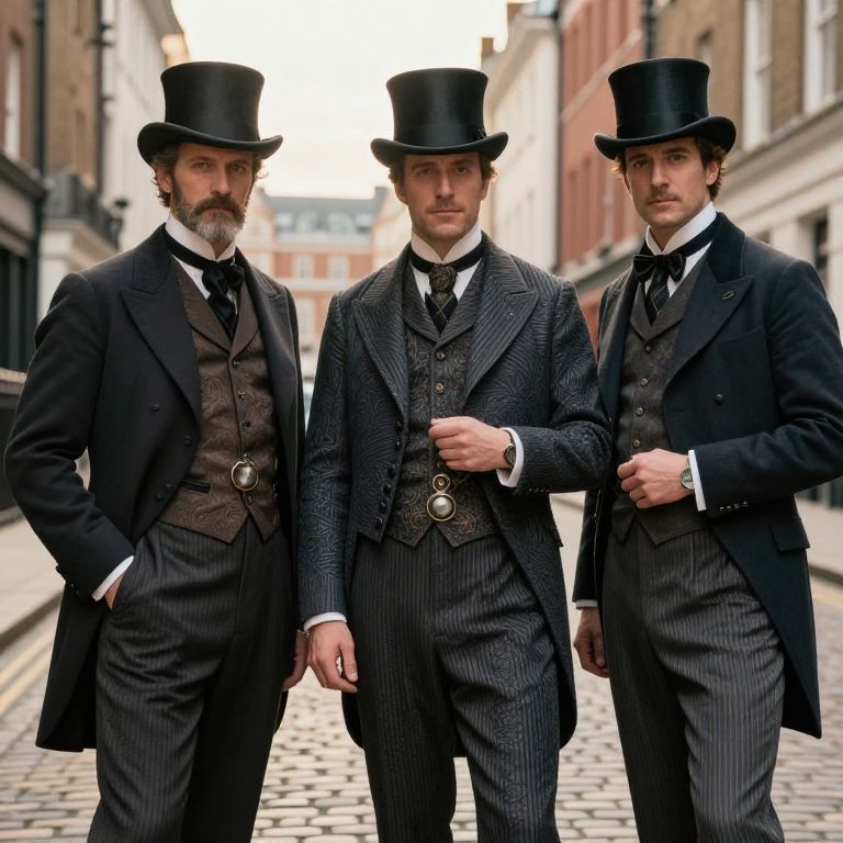 Gentlemans in Victorian-era fashion, standing confidently on a cobblestone street, intricate tailored suits with waistcoats, top hats, and pocket watches, soft golden hour lighting, detailed textures, historic London backdrop, cinematic composition