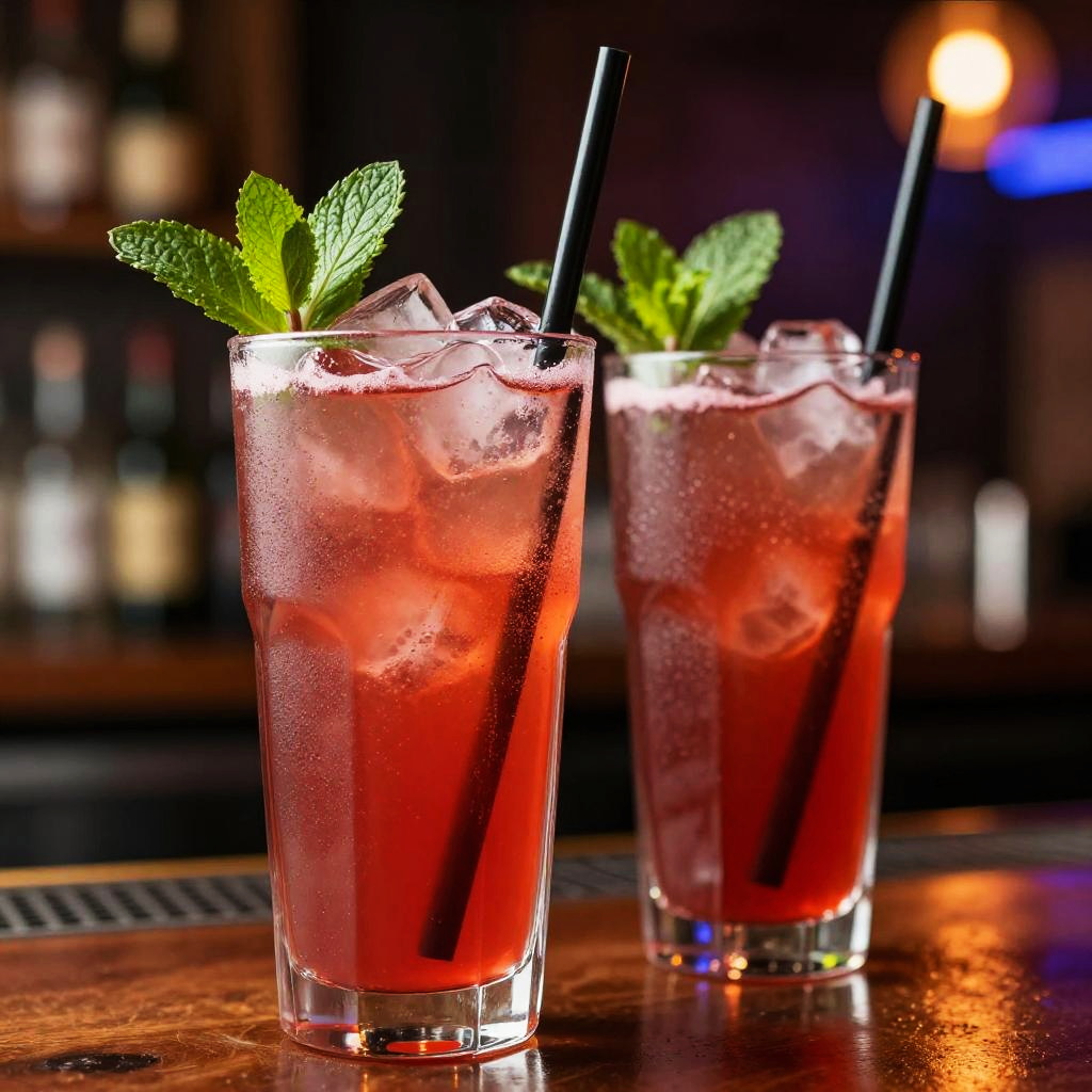 Photograph of two tall, clear glasses of vibrant red cocktails with ice cubes, garnished with fresh green mint leaves, and black straws. The drinks are slightly frosted, with condensation on the glass surfaces. The glasses are placed on a polished wooden bar counter, with a softly lit, blurred background featuring warm, amber lighting and indistinct bar elements. The image emphasizes the refreshing, chilled appearance of the drinks and the rich, dark red color of the liquid.