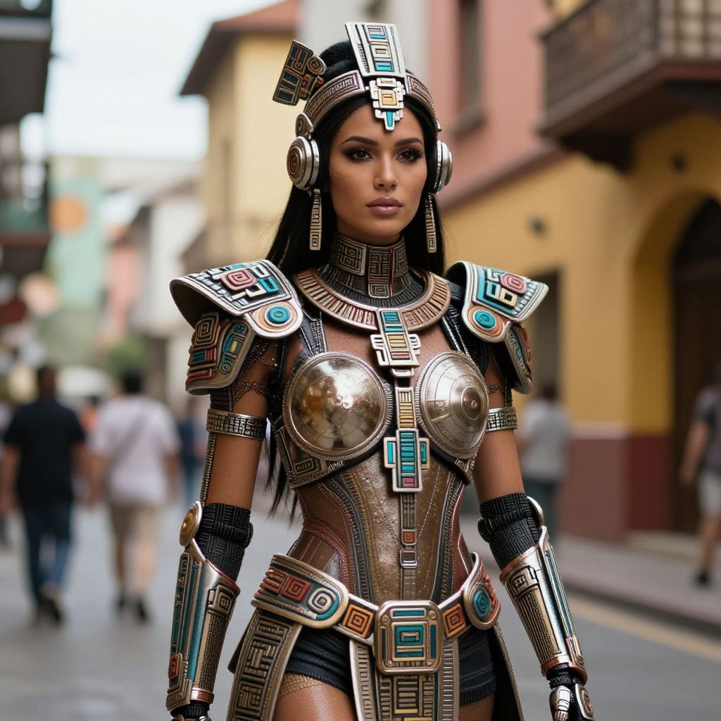 A futuristic cyborg woman with intricate Mayan-inspired armor and a tiara, standing on a vibrant, cinematic street scene with bold and soft lighting.