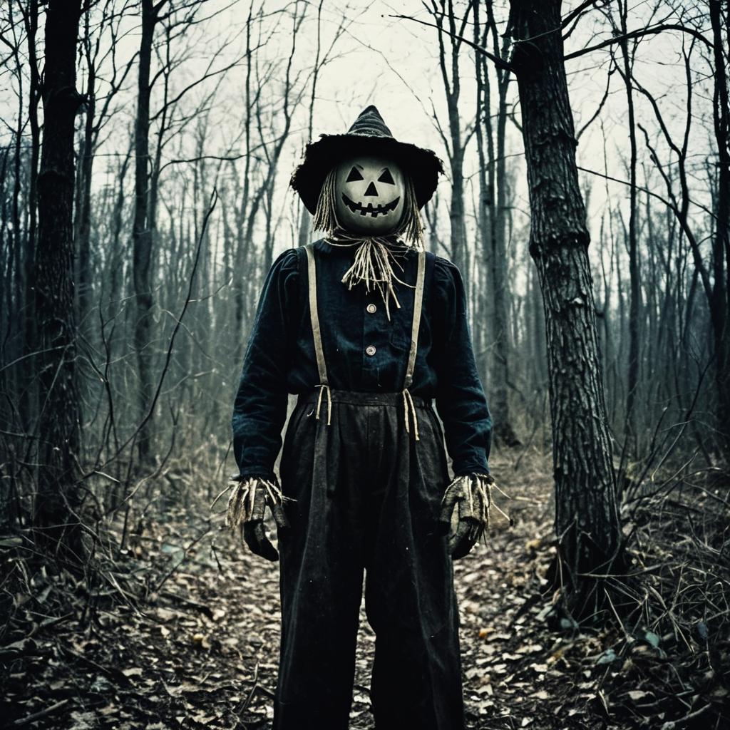 A person wearing a black, vintage-style scarecrow costume with straw details and a mischievous white face mask stands in a foggy, dense forest covered in fallen leaves, creating a spooky and eerie atmosphere.