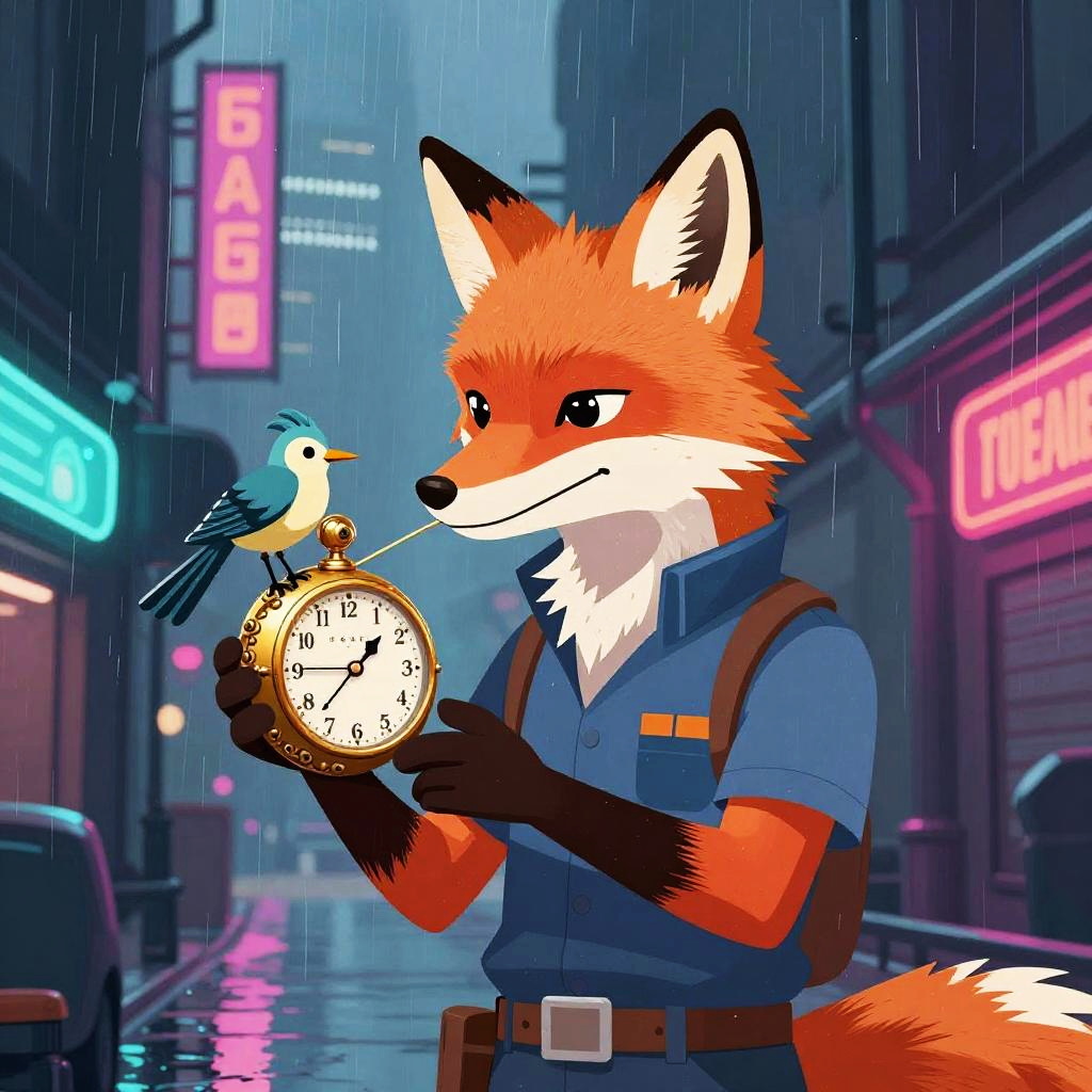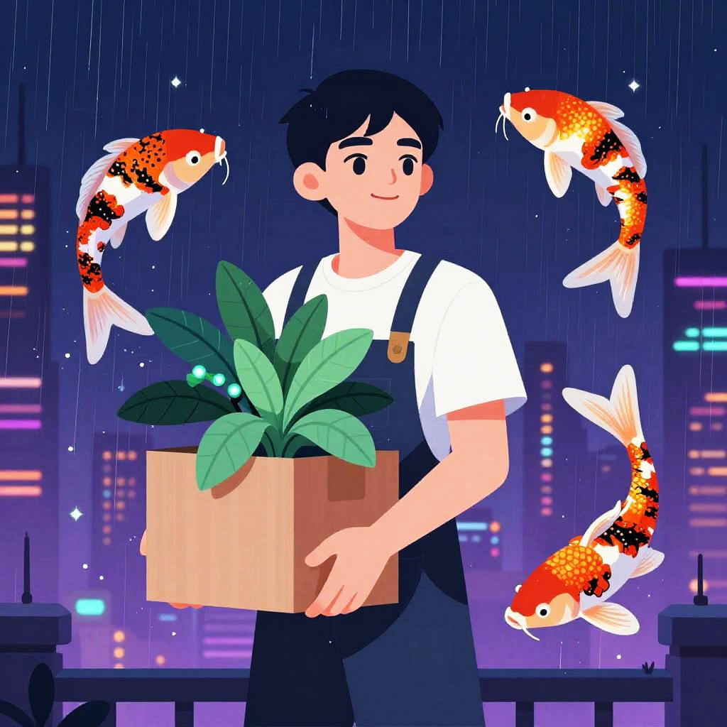 Cyberpunk florist with bioluminescent koi on a undertaking a covert delivery against a rain-soaked neon skyline backdrop. Create a vector illustration that emphasizes stunning detail and aims for hyperrealism in 8k quality.