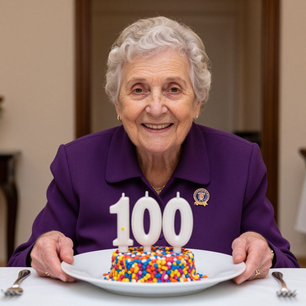 Elderly woman smiling warmly while celebrating her 100th birthday with a colorful, sprinkle-adorned candle centerpiece on a white plate, wearing a purple blazer with a commemorative pin.