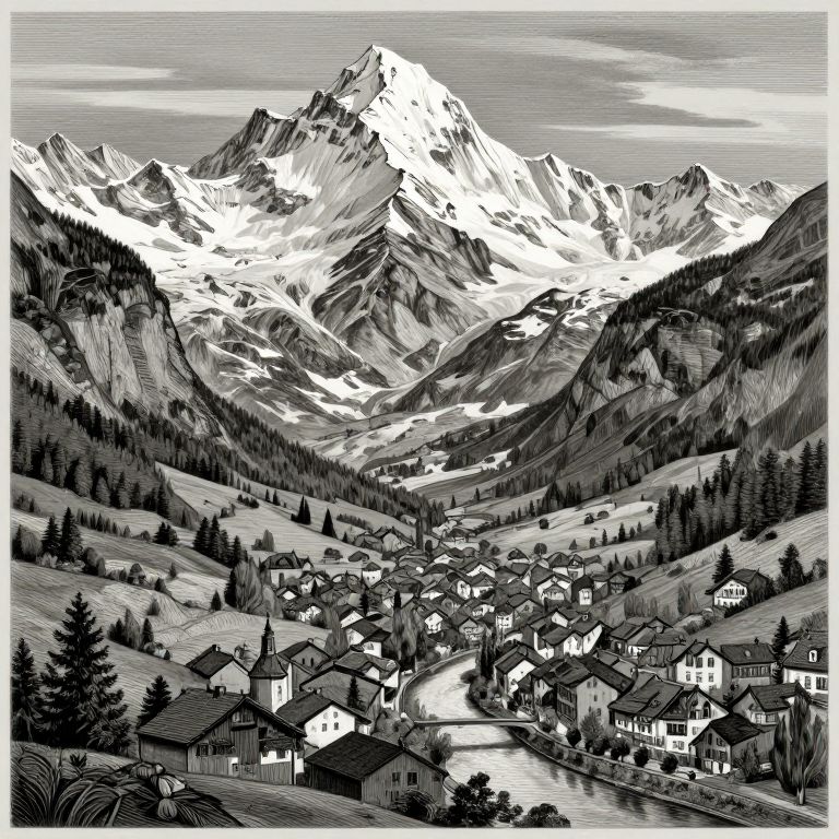 This black-and-white digital illustration depicts a picturesque mountain village nestled in a valley. Snow-capped peaks dominate the background, with detailed textures highlighting the rugged mountain terrain. The village in the foreground features a cluster of small, charming houses with sloped roofs, arranged along winding, reflective rivers. Trees and rolling hills surround the village, adding depth to the scene. The artist uses stark contrasts and fine lines to create a sense of depth and realism, emphasizing the serene beauty of the alpine landscape.