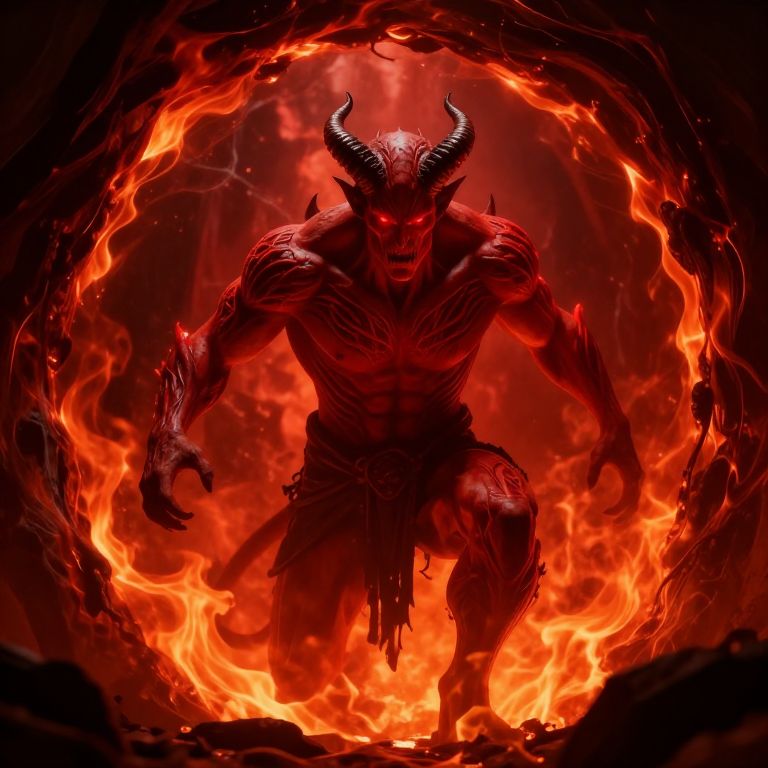 Digital artwork of a muscular, red-skinned demon with black horns, crouching amidst fiery flames, creating a circular inferno around him. Int