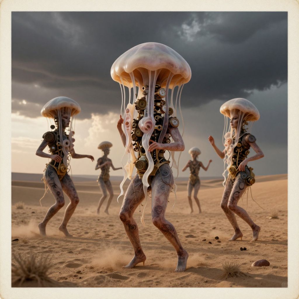 A surreal, dystopian scene featuring hybrid human jellyfish bodies with antique engine parts inside, dancing in a desert landscape with stormclouds overhead, antique postcard color, and a sunset light filtering through.