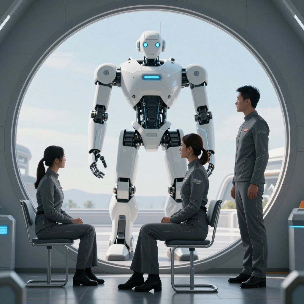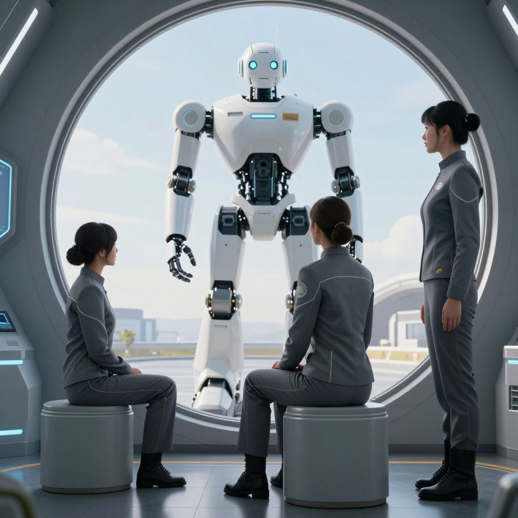 Photograph-style CGI image depicting a futuristic, sci-fi setting. Three Asian women in gray military-style uniforms with black shoes are seated and standing around a large circular window. They face a tall, white, humanoid robot with glowing blue eyes and black joints, standing outside the window. The background shows a bright, sunny exterior with a white structure. The room has sleek, metallic textures and soft, circular stools. The women have black hair in buns, and the robot's design is modern and sleek. The overall atmosphere is professional and futuristic.