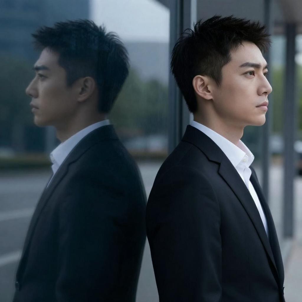 Photograph of a serious, handsome man with short dark hair in a black suit and white shirt, standing in profile against a blue-tinted window. His reflection is visible in the glass, mirroring his determined expression. The background features blurred, vertical blue lines, suggesting an urban setting. The image has a moody, cinematic feel.
