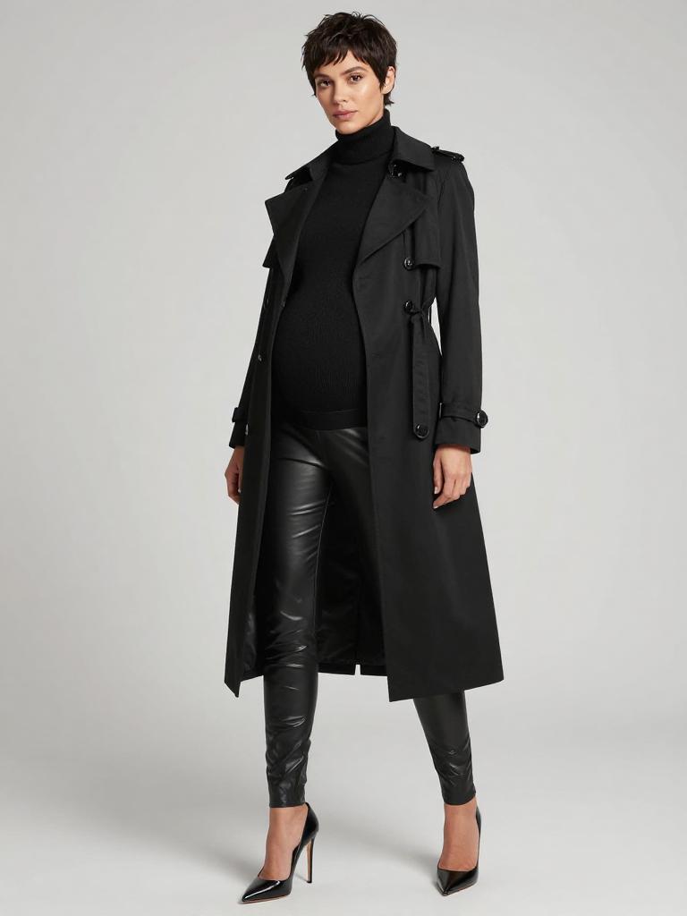 Pregnant fashion, woman with pixie cut with textured fringe and long-limbed runway-model build with maternity curves, in an all-black outfit, sleek monochrome style: fitted black turtleneck sweater hugging the bump, tailored black trench coat cinched at the waist, black leather leggings with a stretchy waistband, sleek black stiletto heels, elegant evening-ready look with glossy textures, standing in plain white seamless backdrop studio background, high-end maternity fashion photography, soft flattering lighting, high resolution, ultra-detailed