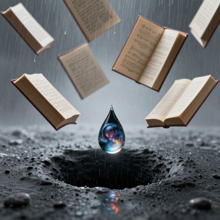 A single raindrop, reflecting a fully-formed universe within it, falls into a black hole that inexplicably transforms it into a symphony of falling mathematics books.