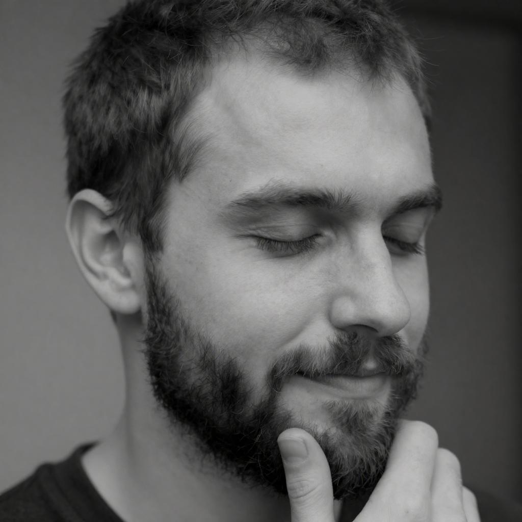 Photograph of a bearded man with tousled brown hair, wearing a black shirt, standing outdoors against a wooden door with glass panels. He has a slight smile and is looking to the side. The background is softly blurred, emphasizing the subject. The lighting is natural, highlighting his facial features.