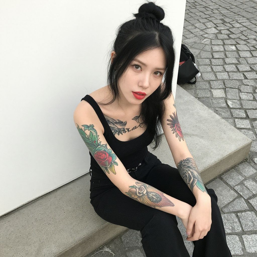 Photograph of an Asian woman with fair skin, black hair in a messy bun, and subtle makeup. She has black, almond-shaped eyes and is looking to the right. Her nails are long and painted black, and she wears multiple silver rings on her right hand. She is dressed in a simple black top. The background features a white, slightly textured curtain. The lighting is bright, emphasizing the contrast between her dark hair and the white background. Her expression is calm and contemplative.