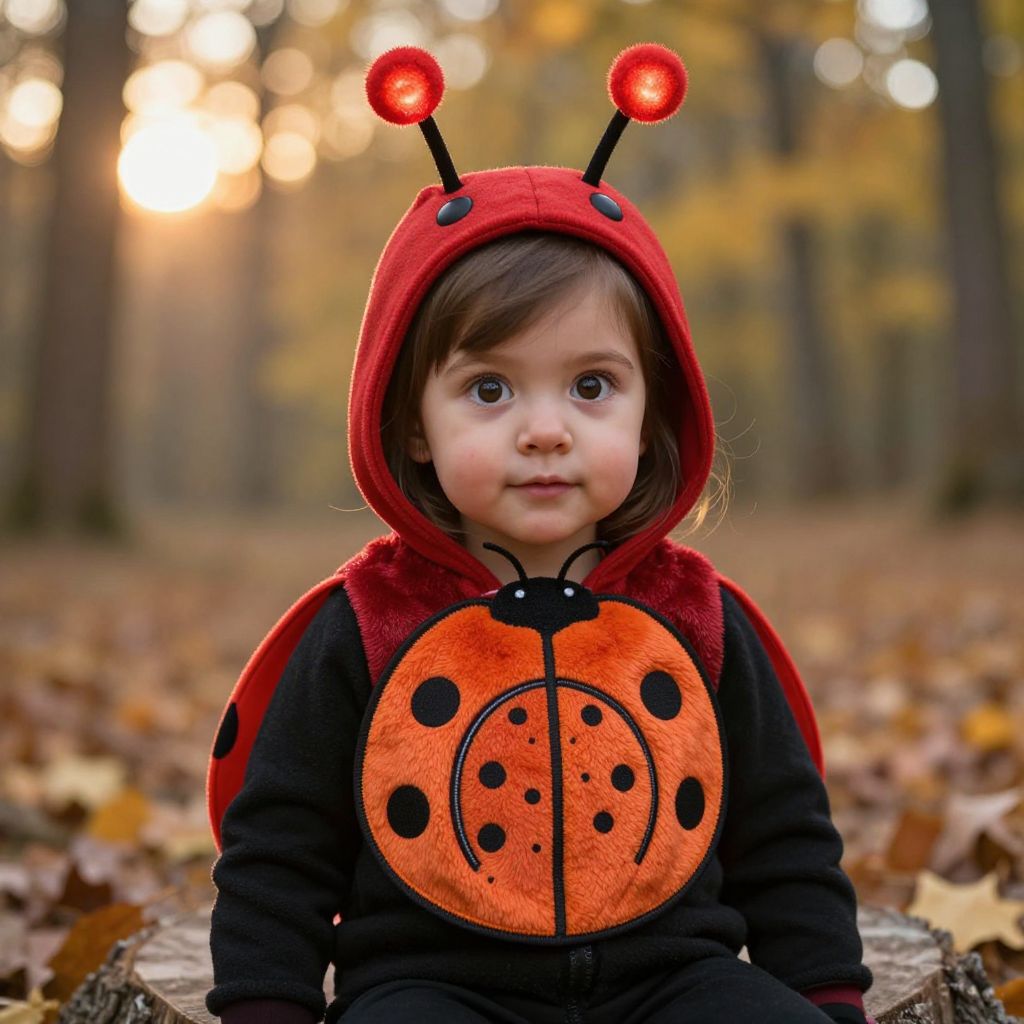 Photograph of a young child with fair skin and brown eyes, wearing a bright red hooded jacket with black and orange ladybug-inspired patterns. The hood features red antennae with small circular lights. The child sits on a tree stump in a forest, surrounded by fallen autumn leaves. The blurred background shows tall trees with golden-yellow leaves and a soft, warm light filtering through. The child's expression is neutral, with a slight upward gaze. The overall mood is cozy and whimsical, capturing the essence of autumn.