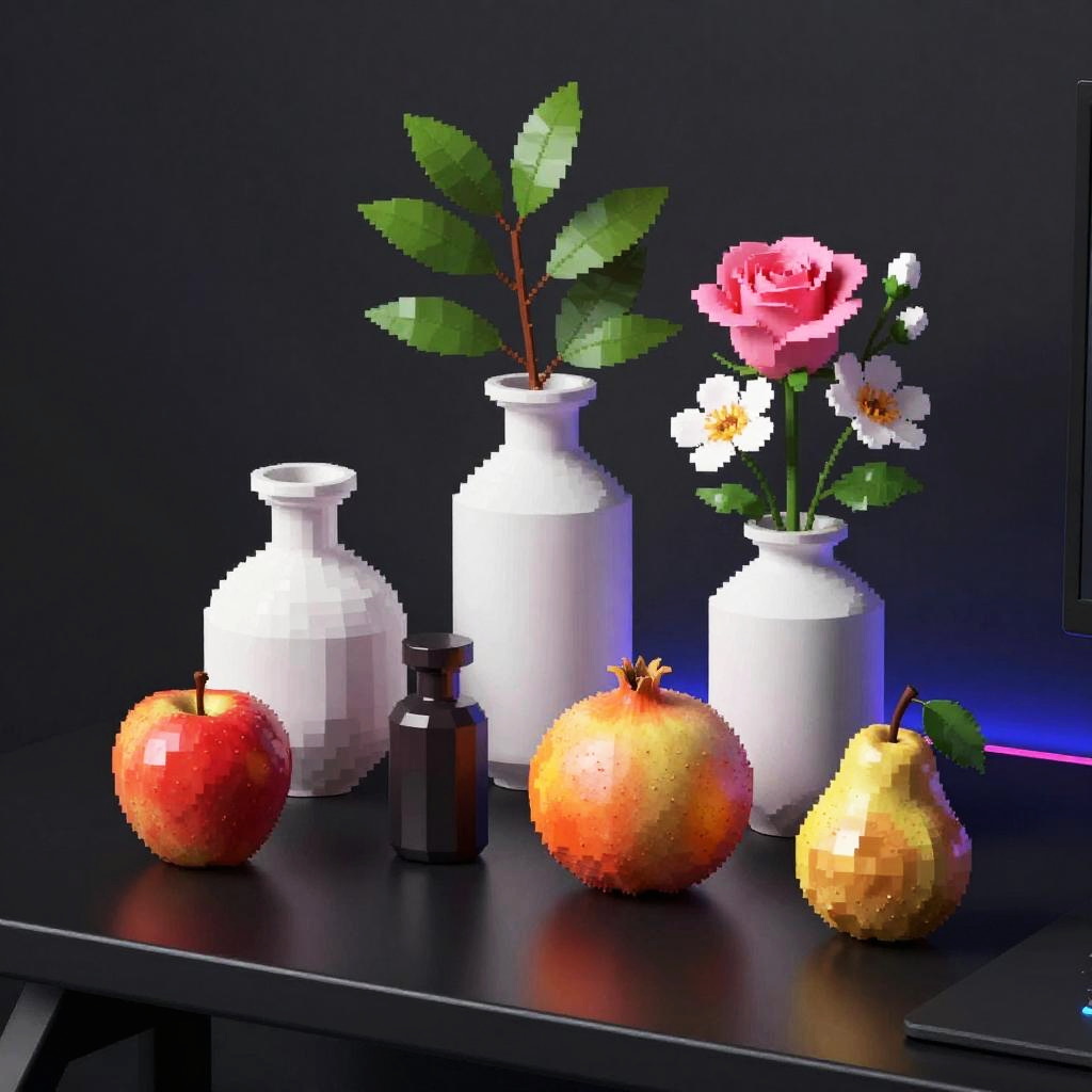 Digital pixel art, glossy jet black gaming desk with RGB backlight, still-life featuring three white vases of varied shapes and a small brown bottle with a dark top; pink roses and white flowers with lively green leaves; fruits arranged around them: a red apple, a yellow-orange pomegranate, another red apple, and a small brown pear with a green leaf; color-cycling dynamic glow; realistic textures, crisp edges, gentle reflections, soft falloff, color-true, editorial quality