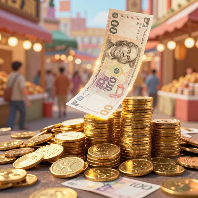 Pagados concept illustrated as stacks of golden coins and glowing banknotes cascading in a bustling market scene, vibrant colors, hyper-realistic style, dynamic lighting highlighting wealth and prosperity, intricate details on currency textures and reflections.
