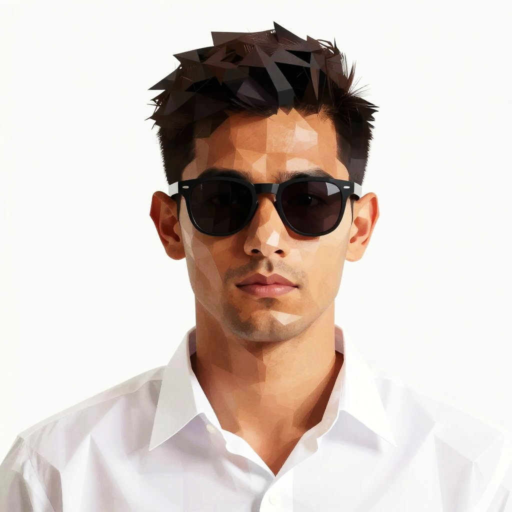 This is a digital, polygon-style portrait of a man with short, dark hair and a medium tan complexion. He's wearing black sunglasses and a white shirt. The image uses bold, geometric shapes to create a modern, abstract look, with a white background that contrasts with his darker features and attire. The man's expression is neutral, and the overall vibe is sleek and contemporary.