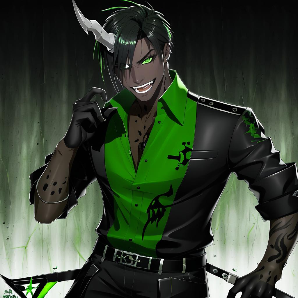 Aragami oga, holostars, 1boy, dark-skinned male, single horn, sharp teeth, green eyes, hair between eyes, hair over one eye, eyepatch, black hair, short hair, black gloves, virtual youtuber, virtual youtuber, by artist suruga (xsurugax), anime