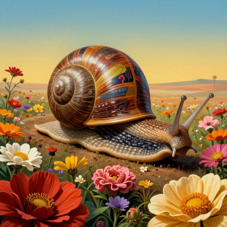 Digital illustration of a vibrant hummingbird with iridescent feathers hovering above a detailed, brown snail with a textured shell, against a translucent glass snow