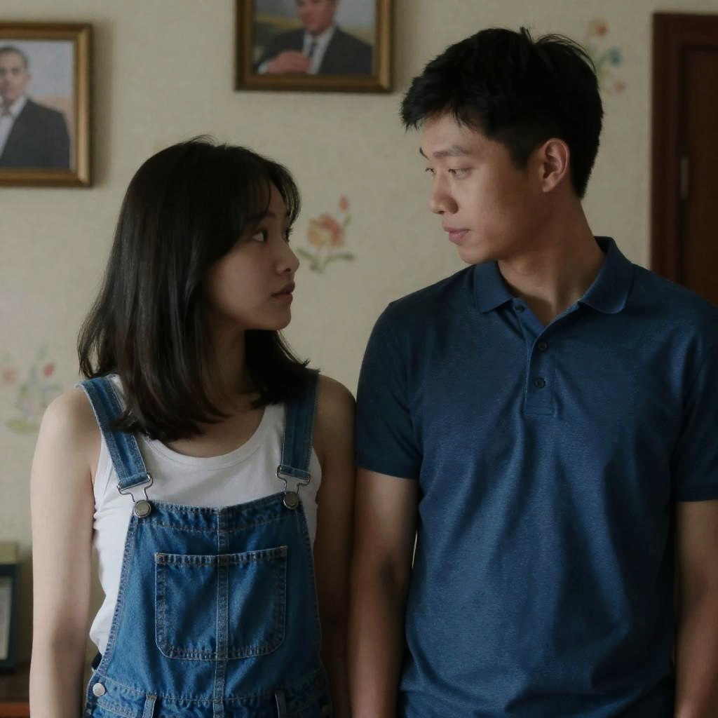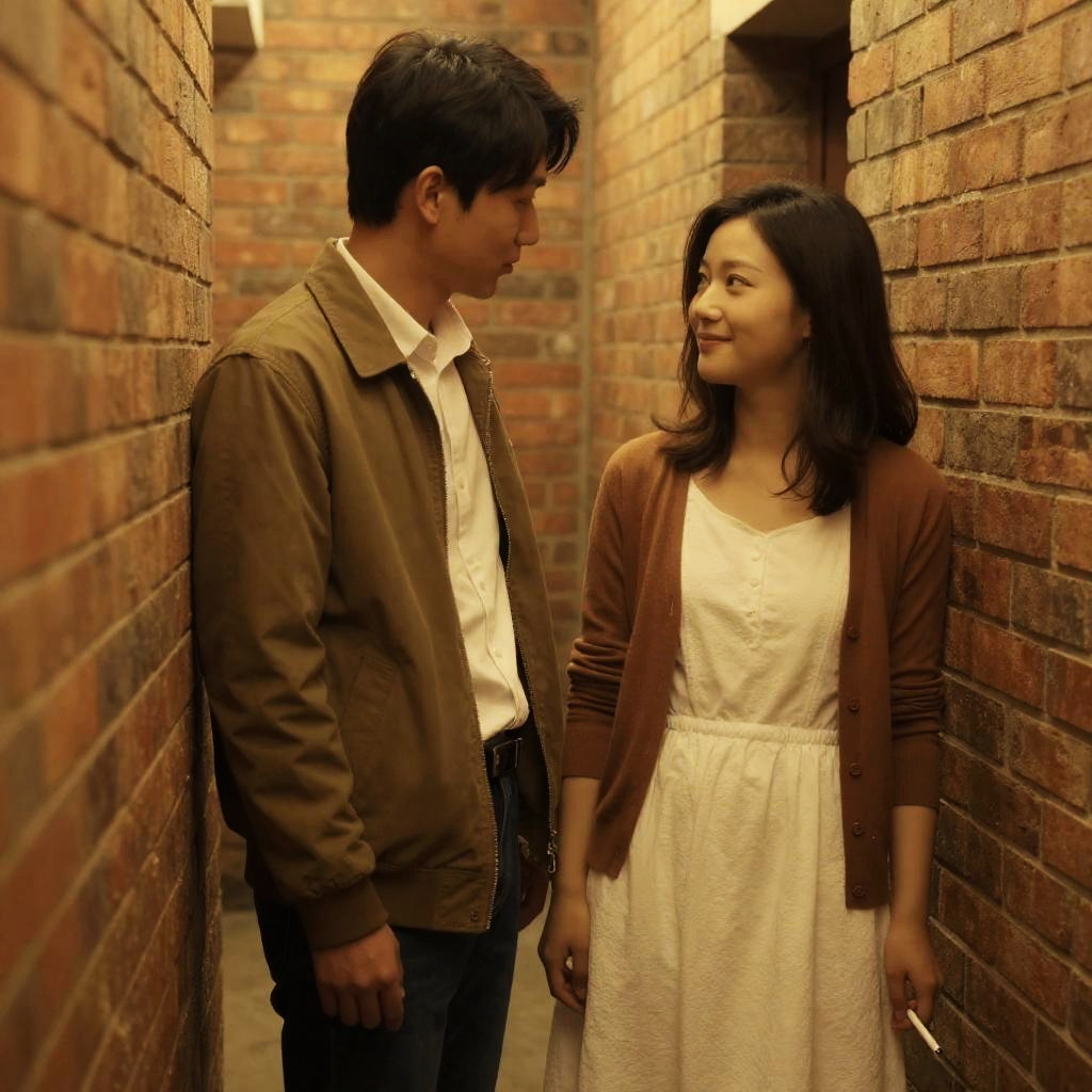 Photograph of two people standing in front of a green door. Man in black suit, woman in beige blouse, black pants. Both smiling, looking at each other. Door with diamond-shaped glass panels, white brick wall with string lights on left. Man on left, woman on right.