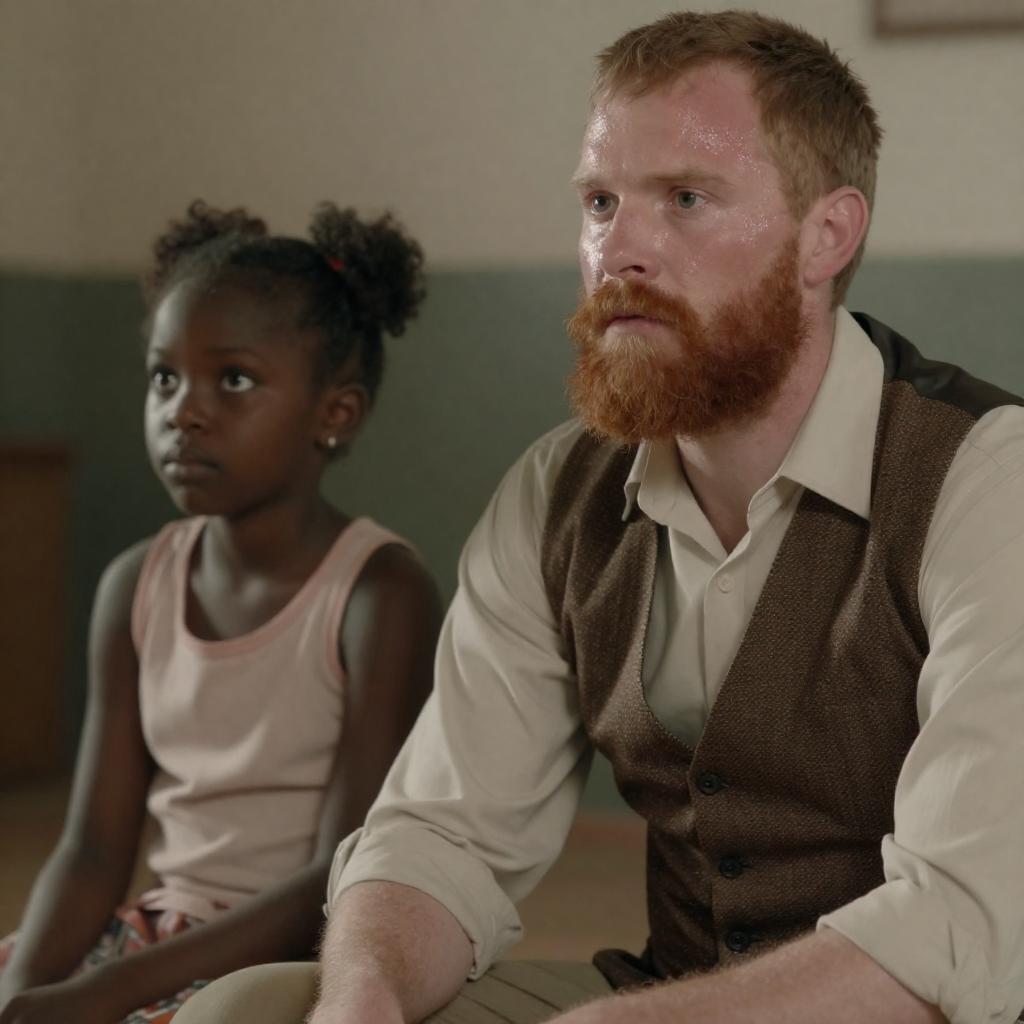 Photograph of a white man with a red beard and mustache, wearing a beige shirt and brown patterned vest, sitting beside a young Black girl with dark skin and short curly hair. Both look to the left with serious expressions. The man has a slightly sweaty face, and the background is blurred.
