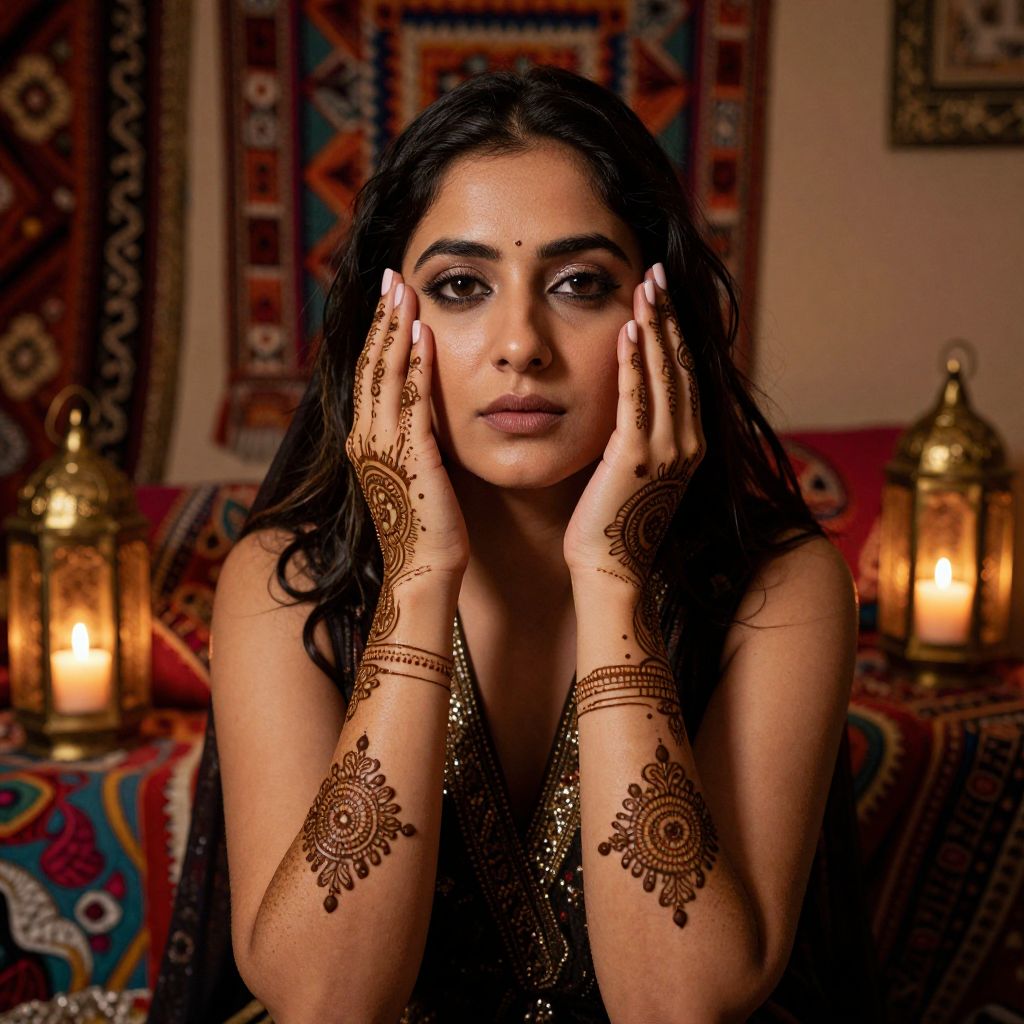 Photograph of a beautiful South Asian woman with dark hair, intricate henna designs, and dark eyes, hands on face, surrounded by warm lanterns