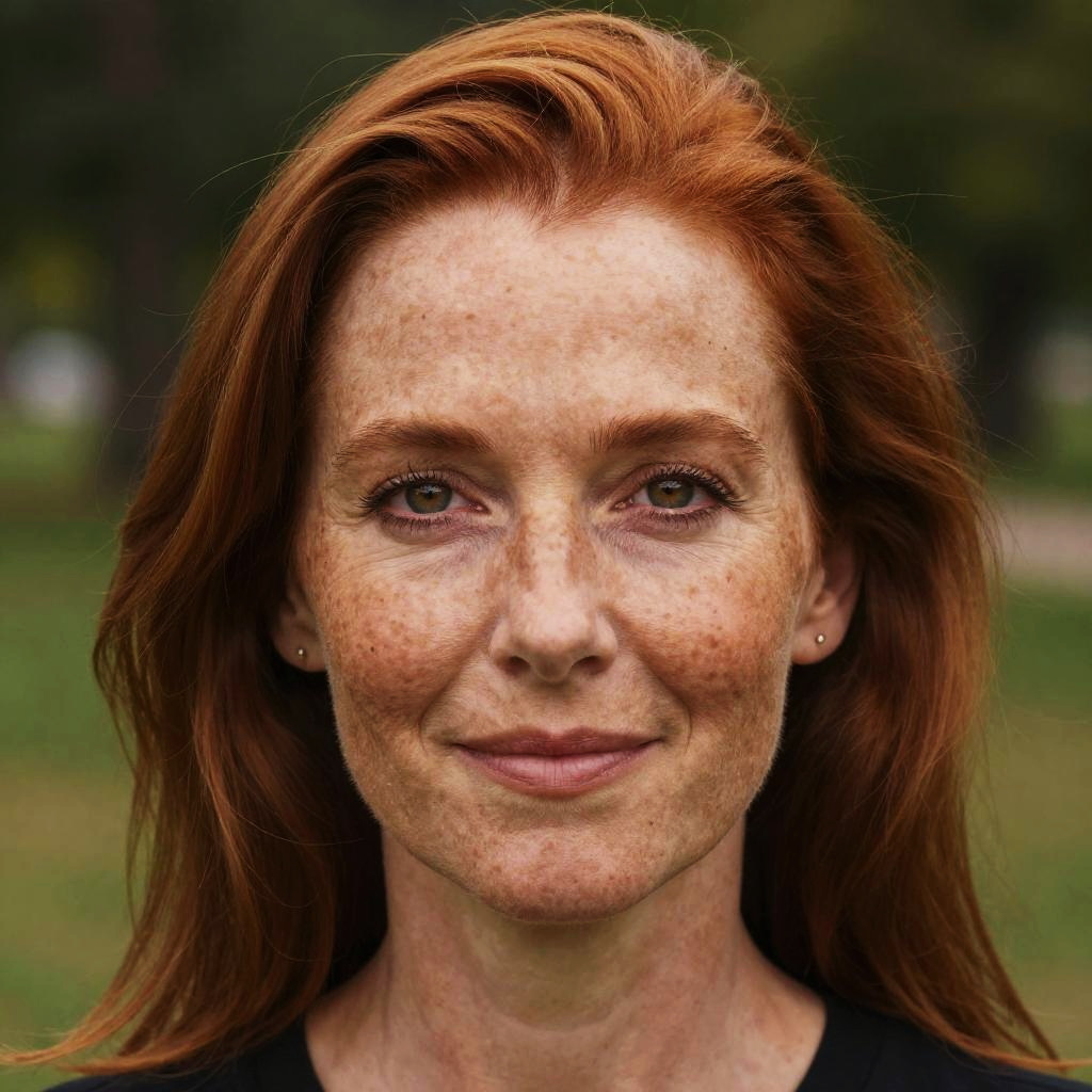 Photograph of a red-haired woman with freckles, covering her mouth with her hands. She has blue eyes and is wearing a blue jacket. Her face is partially obscured by green pine needles in the foreground. The background is blurred, focusing attention on her expressive, slightly worried expression.