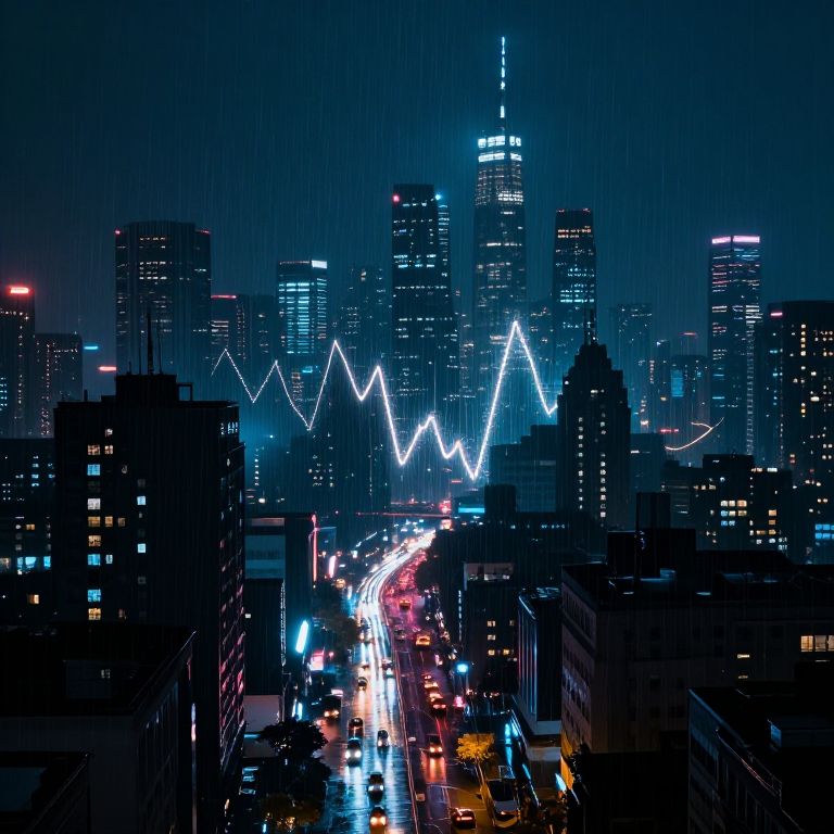 Zigzag prompts projected onto a rainy city skyline at night, blending urban decay with digital trails and pulsating light, atmospheric and cinematic, inspired by cyberpunk and digital dreamscapes.