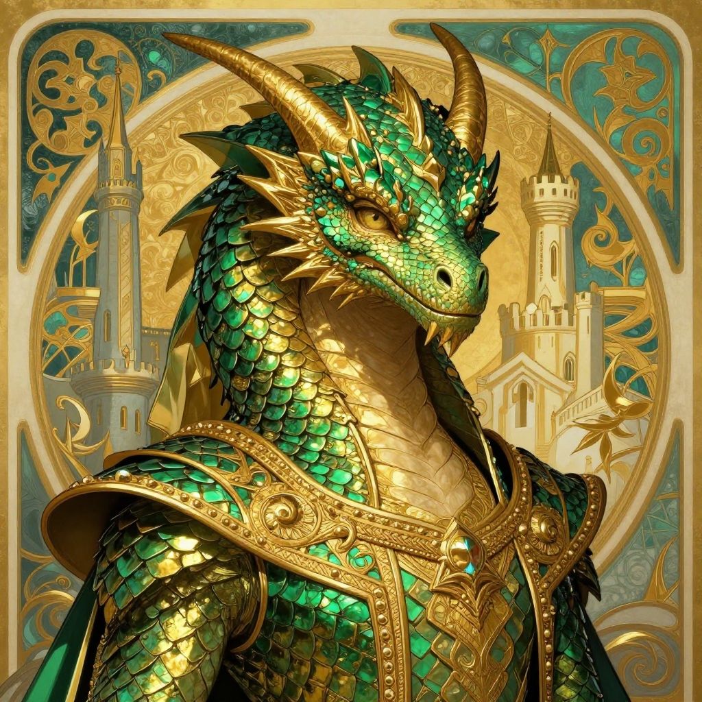 Fantasy portrait art of a dragonborn noble with scales shimmering in gold and emerald, regal attire, intense gaze, fantasy castle backdrop, intricate details, art nouveau influence