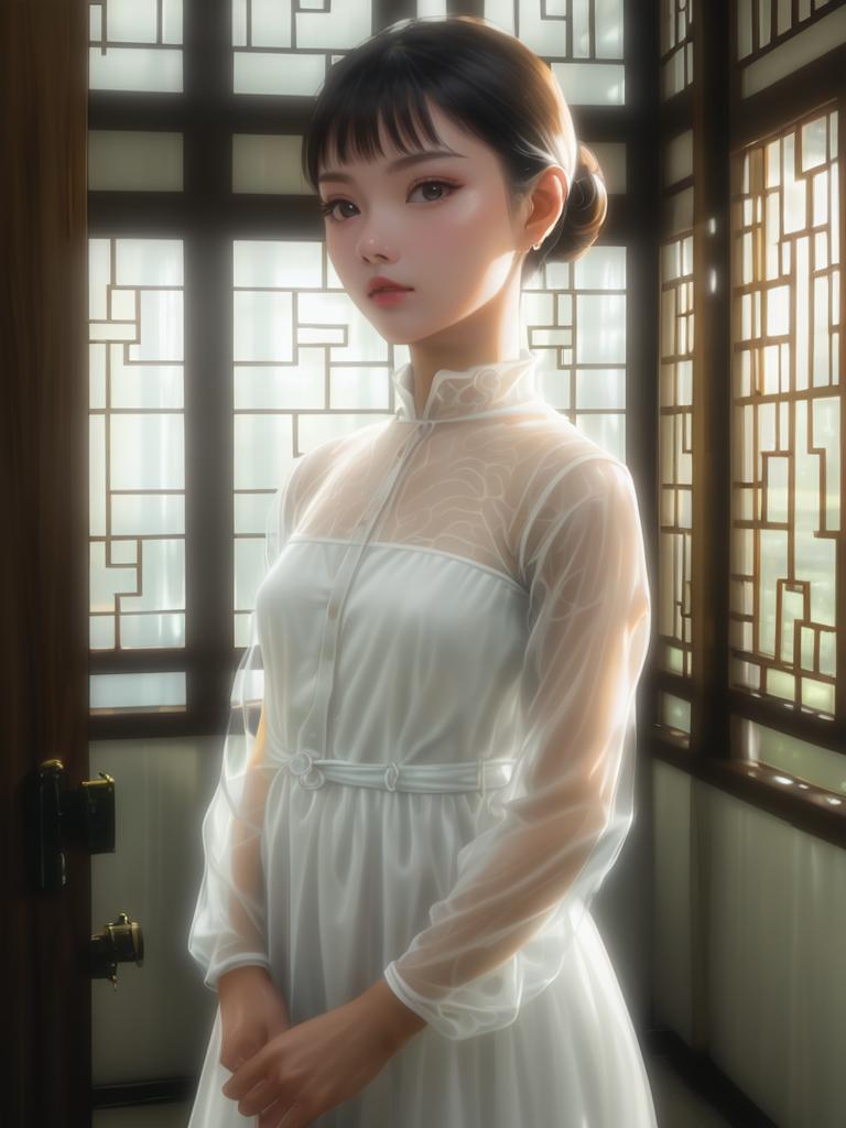 Photorealistic image of an Asian woman with brown hair styled in a single bun, wearing a white dress with sheer, see-through long sleeves and a high collar. She stands indoors near traditional wooden lattice windows with soft natural light illuminating her face. Her lips are slightly parted and her gaze is directed to the side, capturing a delicate and elegant pose.