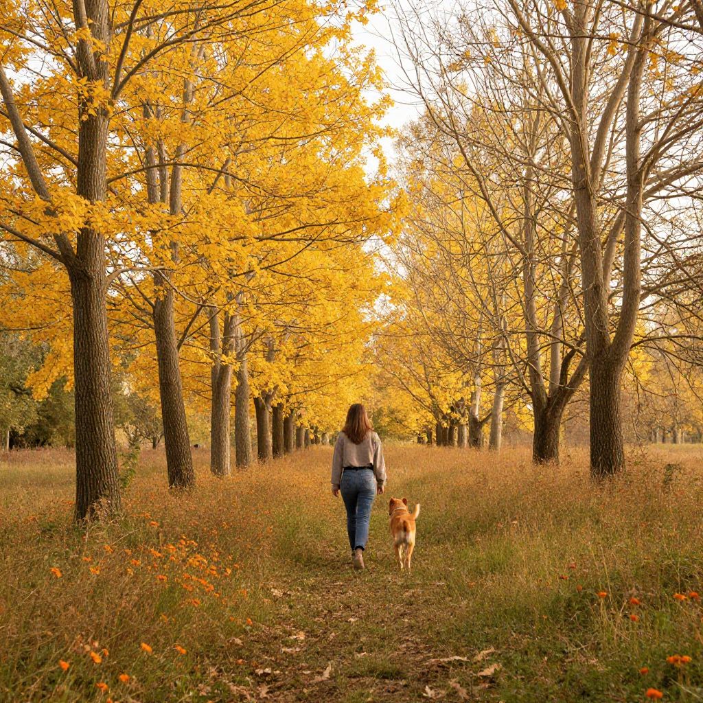 Woman strolling through a vibrant autumn landscape with her orange dog, surrounded by tall trees adorned with golden leaves and dotted with small orange flowers beneath a soft, warm sky.