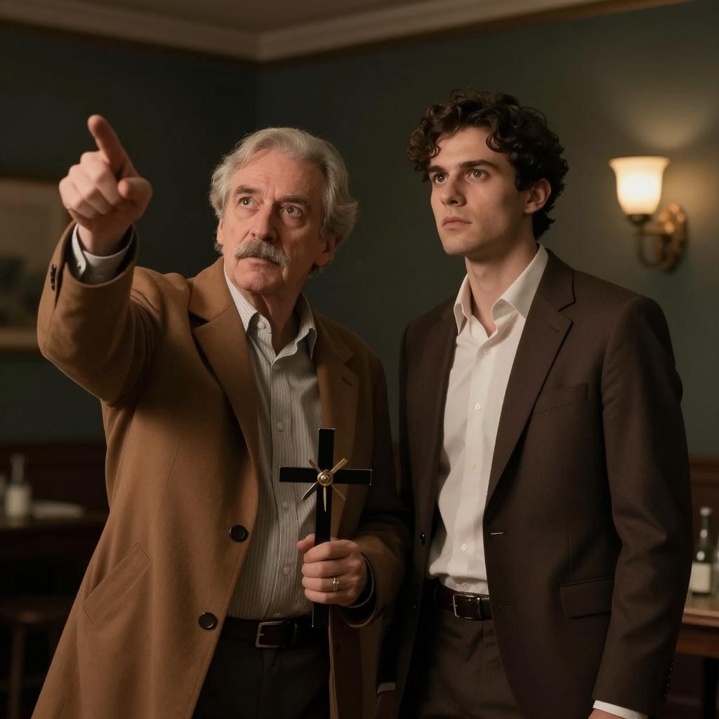 Older man with gray hair and beard, wearing blue shirt, extends arm pointing forward. Shirtless young man with brown hair and headband stands to his right. Older woman in white shirt, bearded man in white shirt in background. Outdoor setting with house and palm tree.