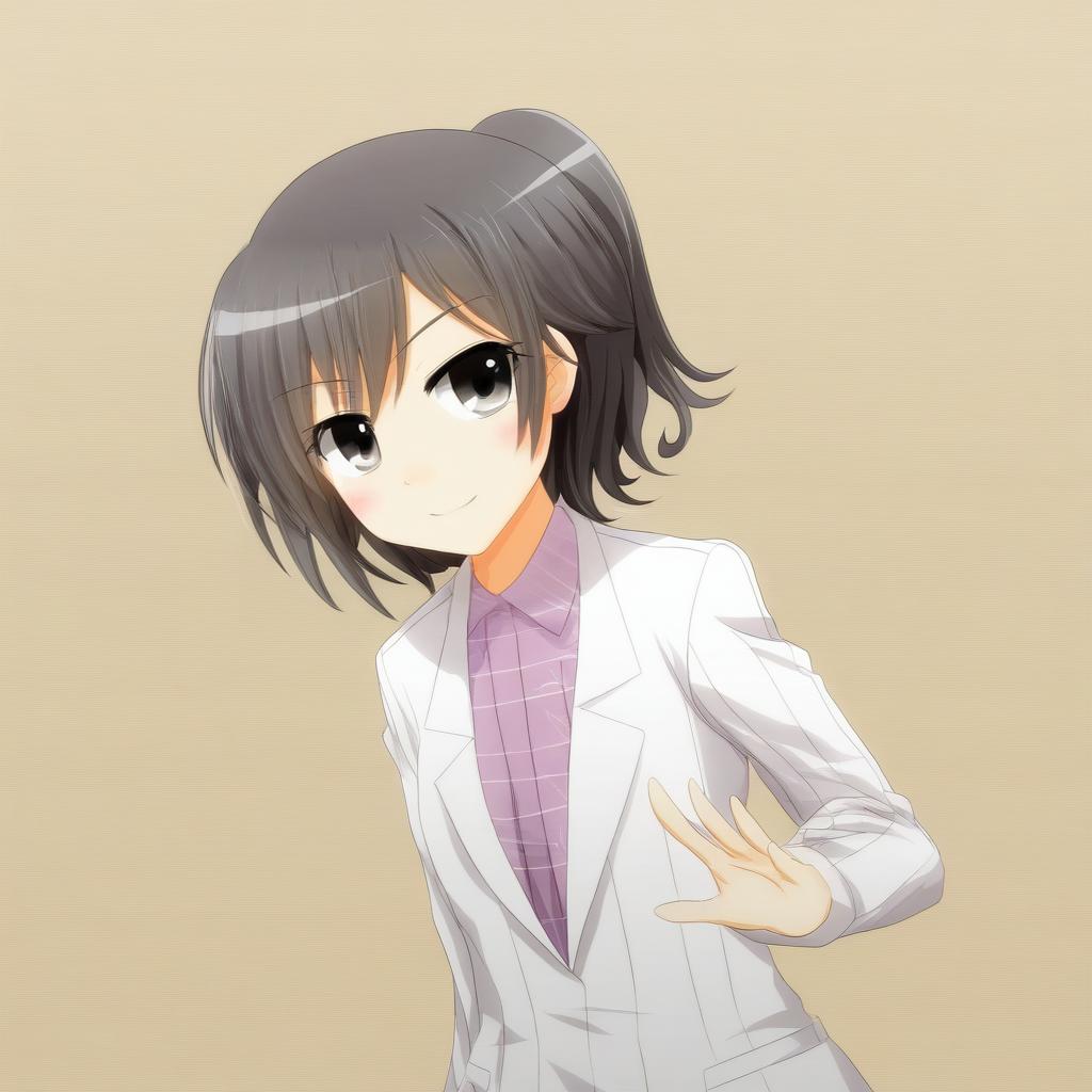 Illustration of a young anime girl with short black hair tied in a ponytail, wearing a white lab coat over a pink checkered shirt. She has large black eyes and a slight smile, with a beige background. The character is raising her right hand in a waving gesture.