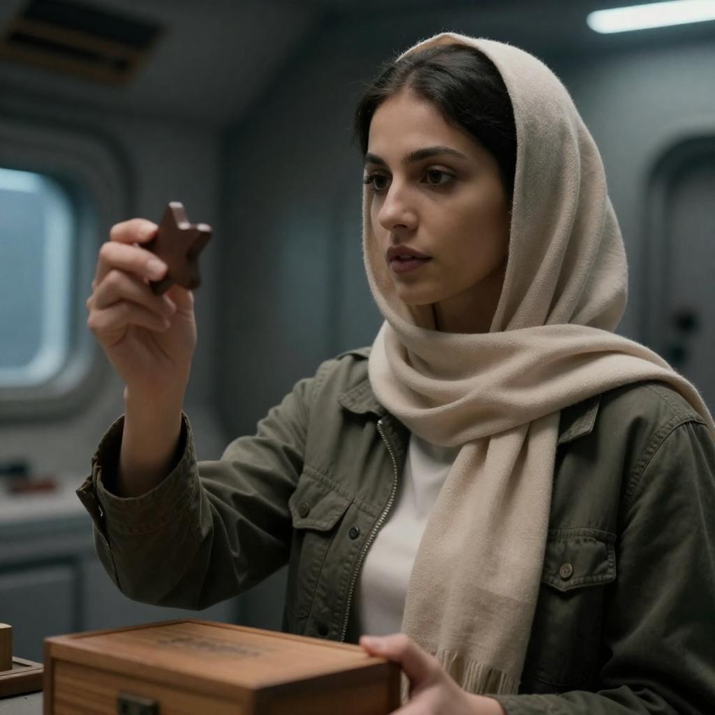 An olive-skinned woman with dark hair wearing a beige headscarf and green jacket over a white shirt holds a wooden box in her left hand and a brown star-shaped object in her right hand. She is inside a dimly lit spaceship with curved walls and blue-lit windows. Her expression is focused, highlighting a moment of concentration.