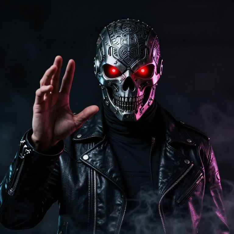 A person with a skull-like mask covered in intricate patterns and glowing red eyes, wearing a black leather jacket, is standing in a dark and shadowy environment, The mask is made of metal and has a futuristic design, with glowing red lights, The person's hand is raised, as if in a gesture of defiance or warning, [Digital art, cyberpunk style], [Reference: Beeple], [High contrast, dark colors, neon lighting, sharp edges, metallic textures, smoke and fog effects]