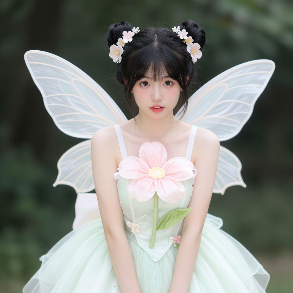 Candyland fairy costume, 1girl, solo, dress, flower, double bun, hair bun, hair ornament, hair flower, black hair, realistic