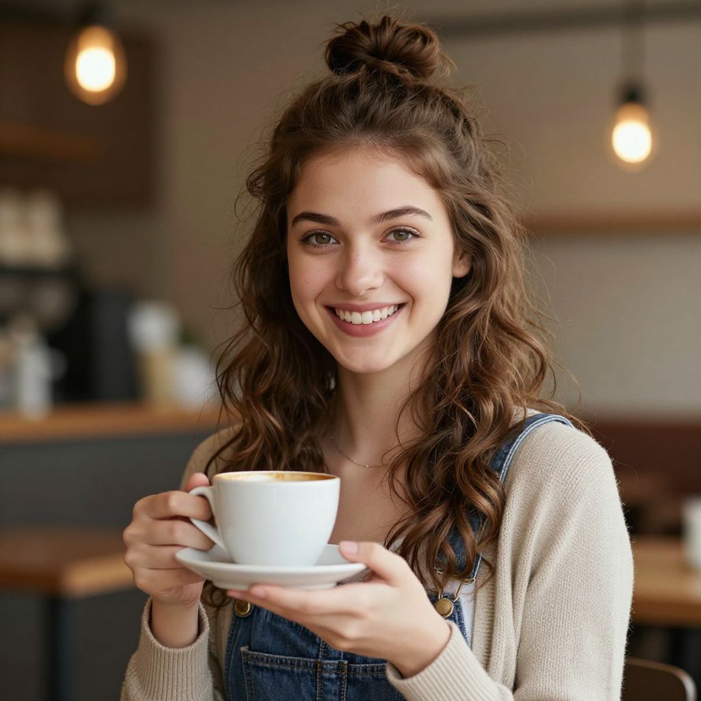 Photograph of a smiling young woman with long, wavy brown hair tied in a messy bun. She's wearing a beige cardigan over denim overalls and holding a white cup on a saucer in front of her. The background is blurred with warm, glowing lights, suggesting a cozy café setting. Her bright, friendly eyes and genuine smile make the image warm and inviting.