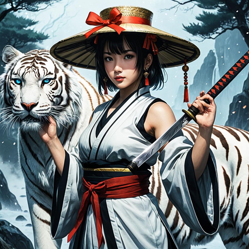 Anime Priestess with White Tiger and Katana
