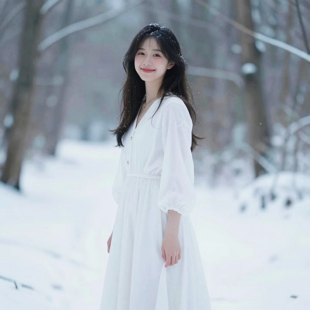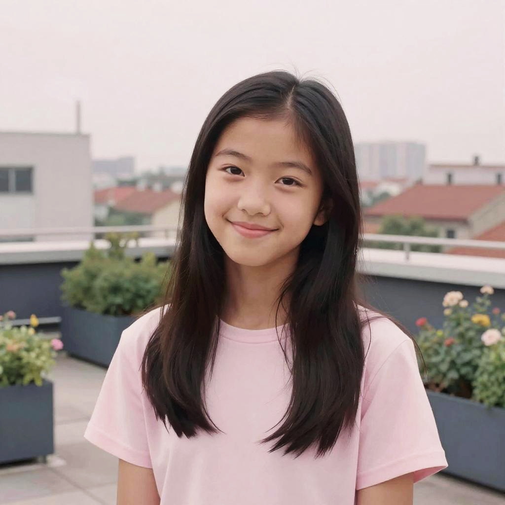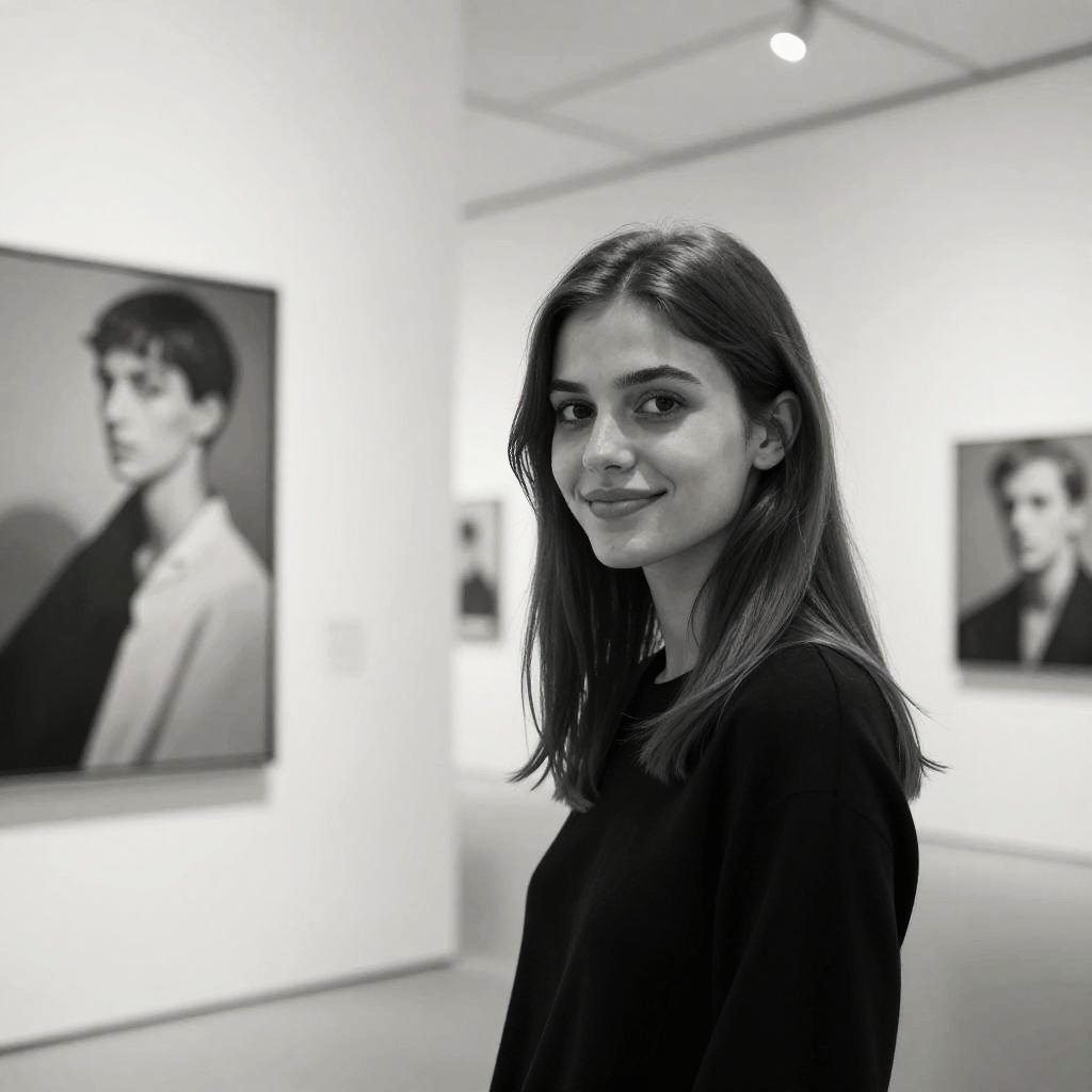 A black-and-white photograph of a young woman with long, straight dark hair, wearing a black top, smiling slightly. She stands in a gallery with blurred portraits on the white walls behind her. The portrait on the left shows a young man with short hair and a light-colored shirt, while the one on the right features a woman with dark hair and a serious expression. The gallery has a modern, minimalist aesthetic with white walls and ceiling lights. The image has a shallow depth of field, focusing on the woman while the portraits are out of focus.