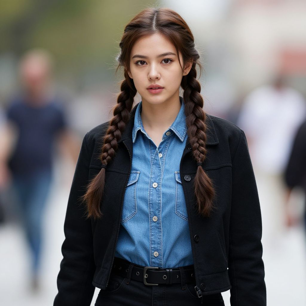 Photograph of a young woman with light brown skin and straight, dark brown hair in two braids. She has large, dark brown eyes and a slight smile. She wears a white and black zip-up jacket over a black top. The background is blurred, showing indistinct figures and a neutral-colored wall, suggesting an indoor setting. The image is sharp, with a shallow depth of field focusing on the woman, who stands centered in the frame. Her makeup is minimal, and she has a natural, fresh appearance. The lighting is soft and even, highlighting her facial features.