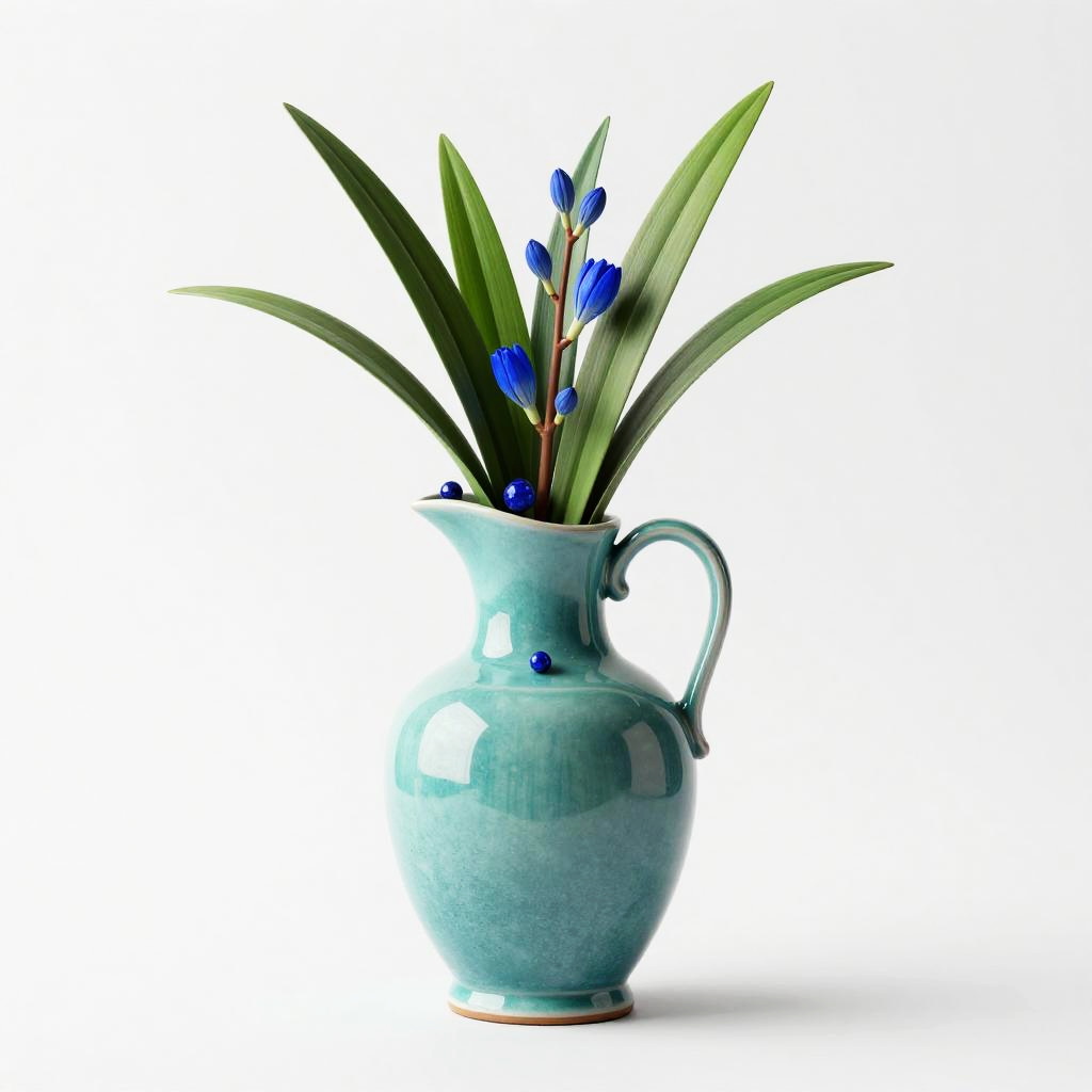 A contemporary still-life of a brushed teal porcelain jug, filled with long viridian leaves, tiny cerulean buds, and small lapis ornamental stones. Executed in high-end 3D render with bold shapes, crisp edges, matte–gloss contrast, and careful negative space. Clean white gallery backdrop, vivid blues and greens, high contrast, subtle paper grain, refined lighting, serene mood, editorial quality.