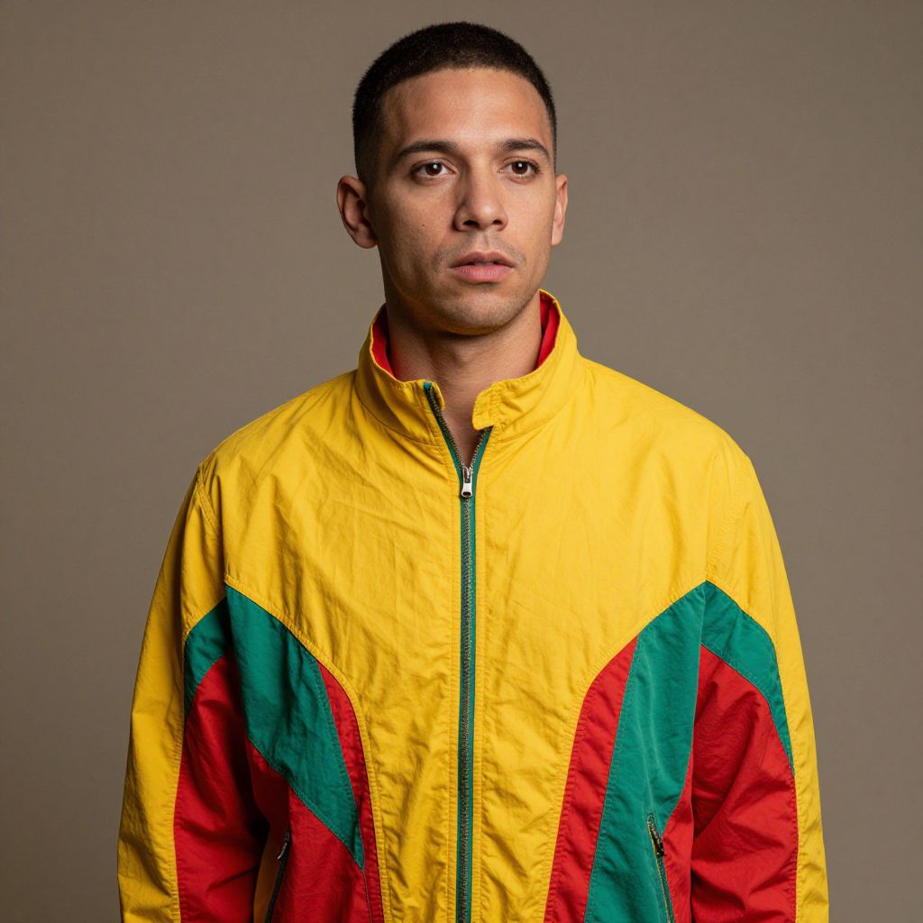 Photograph of a young man with short black hair and light brown skin, standing against a plain gray background. He is wearing a brightly colored, zip-up jacket with a high collar, featuring a bold yellow base color and large green and red diagonal stripes on the sleeves and chest. The jacket has a slightly shiny, textured fabric. He has a neutral, slightly serious expression, looking directly at the camera. The lighting is even, highlighting his facial features and the vibrant colors of his jacket.
