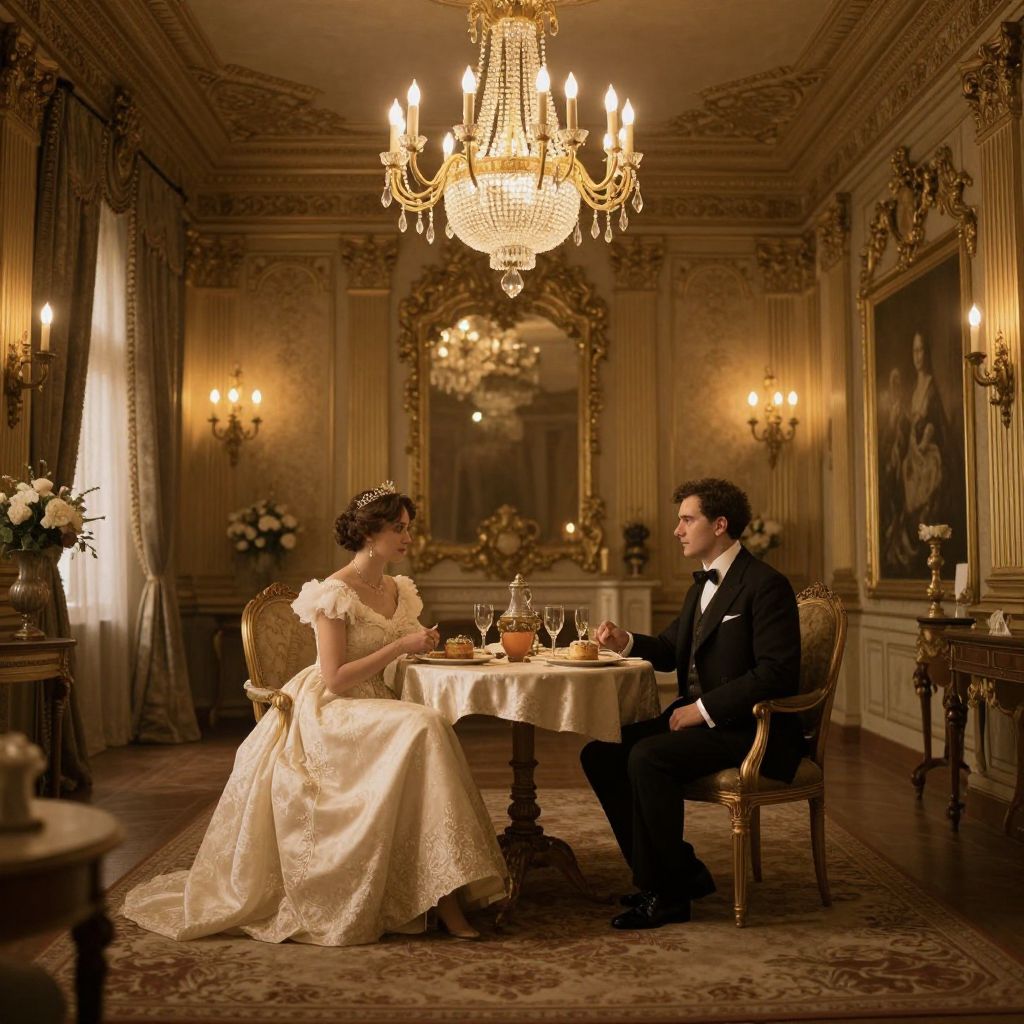 Elegant couple stands poised in a Victorian-era setting, with the man in a dark suit and bow tie embracing the woman in a flowing cream gown adorned with gold trim, while a richly decorated tea set rests on a maroon table draped with intricate floral carpeting beneath them.
