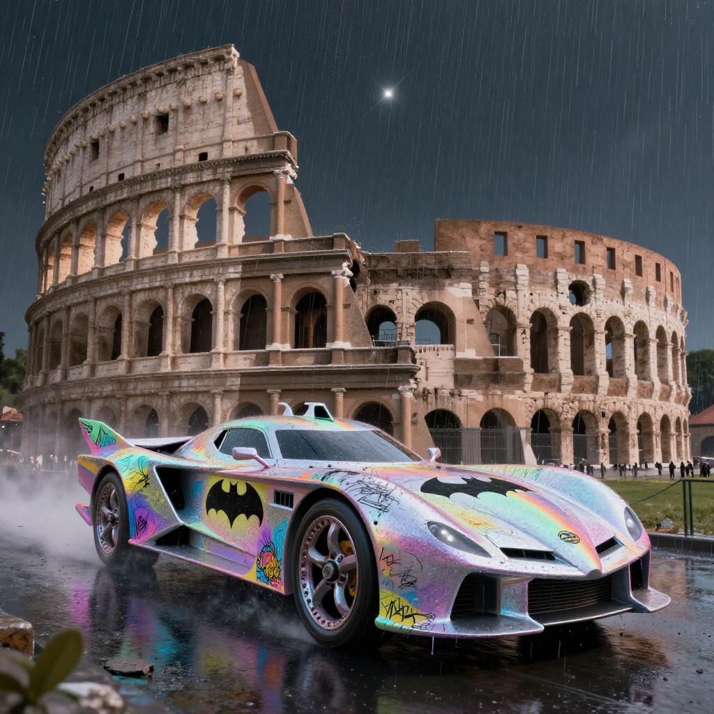 A 3d render of pastel, two Batmobiles made of liquid metal mercury chasing in the Aetherpunk style Ancient Rome Colosseum, octane render, night time, raining weather, heavily rain, photorealistic, highly detailed, intricate, focus, sharp, mjart, vray-render, chempunk-96, photohelper, minimal, simplistic, amazing composition, vaporwave, wow, minimalistic graffiti masterpiece, minimalism, 3d abstract render overlayed, psychedelic therapy, ink splatters, pen lines, insanely detailed and intricate, positive energy, unique, negative space, pure imagination, epic, exciting, cinematic, moody, UHD, lens flare, stop motion, soft lighting, celestial, professional, 35mm, Zeiss, Hasselblad, Fujifilm, Arriflex, IMAX, trending on artstation, artstationhd, 4k, 8k.