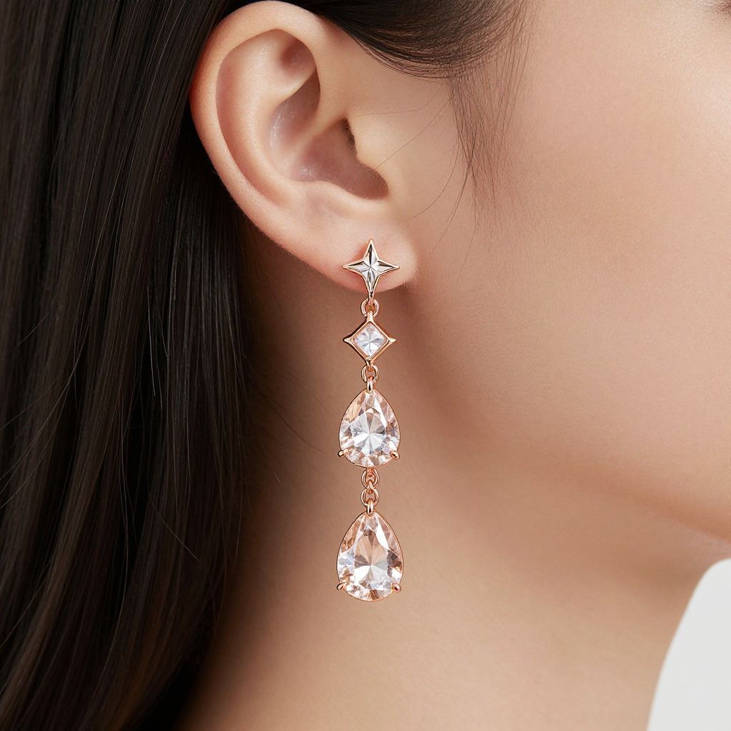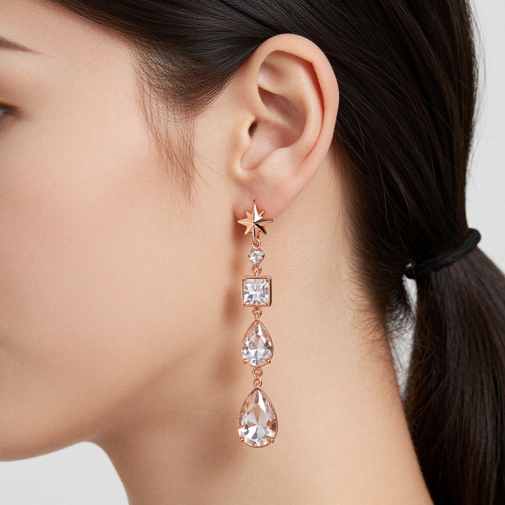Elegant rose gold crystal drop earrings adorn a woman's ear, featuring a cascading design with a four-pointed star, a square gemstone, and two pear-shaped crystals suspended gracefully against her smooth skin and dark hair.