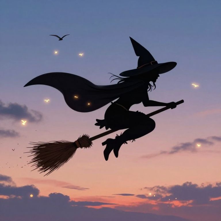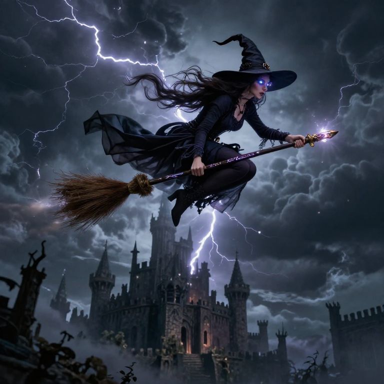 Flying witch on broom soaring through a moonlit night sky, glowing full moon in background, wearing a flowing dark cloak and pointed hat, mystical aura, swirling clouds, distant stars twinkling, enchanted forest below, fantasy art style.