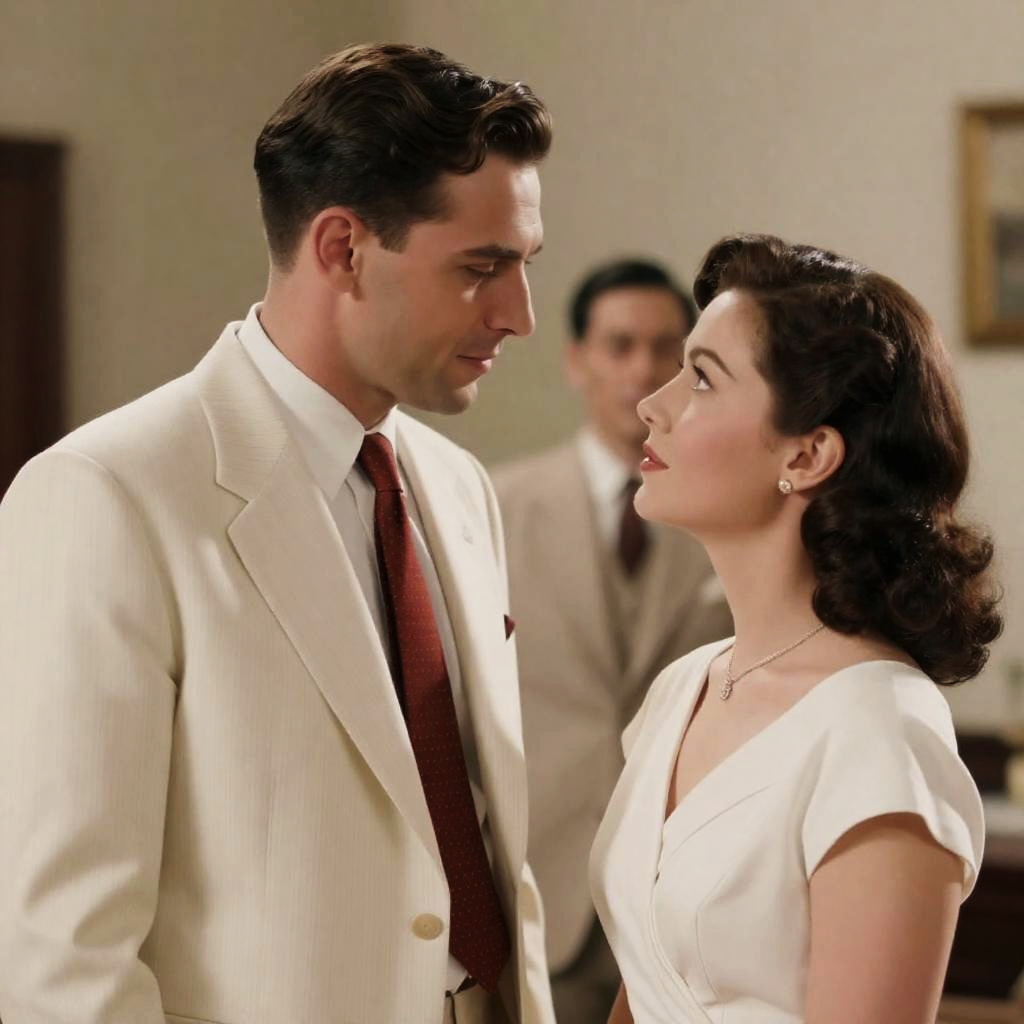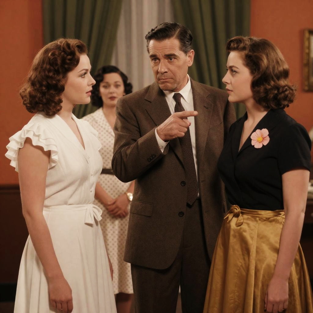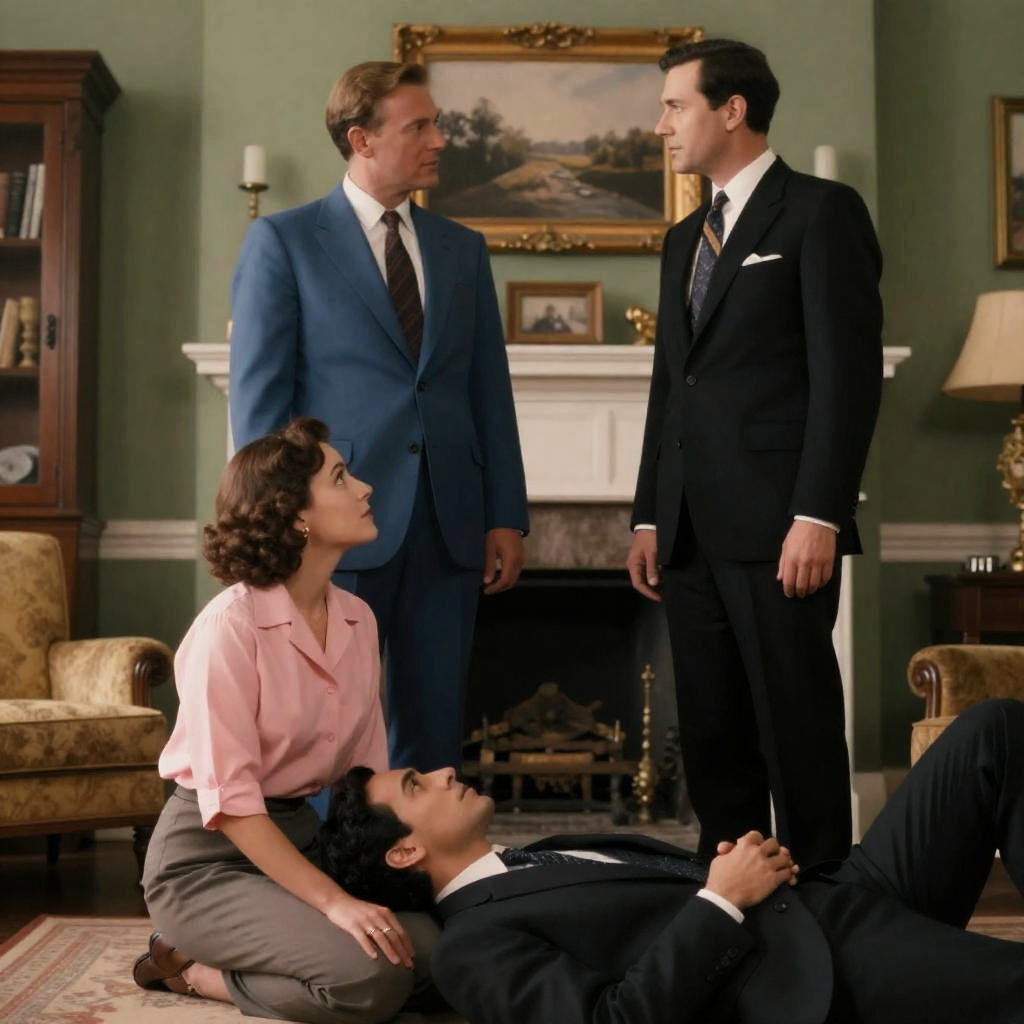 A vintage-style illustration shows two men in pinstripe suits and bow ties. The man on the left, with dark hair and a yellow tie, points a cane at the seated man, who has dark hair and a blue tie. An inset circle shows a close-up of the seated man with a woman in a yellow dress. The background includes a green curtain and dark furniture.