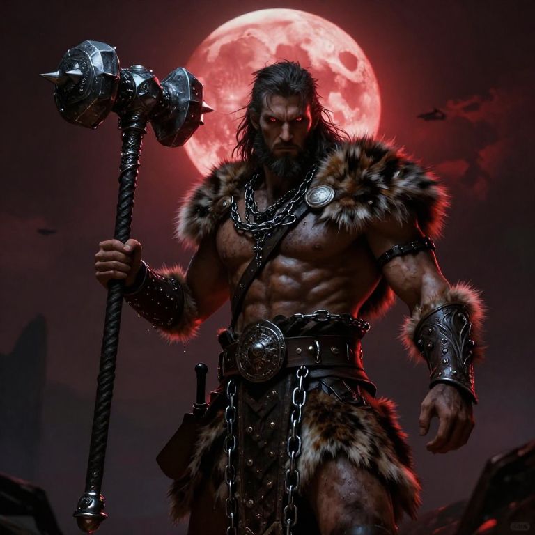 Male barbarian fantasy art, wild fighter with animal pelts and heavy chains, standing beneath a blood-red moon, gripping a spiked mace, barbaric and primal essence, dramatic shadows and glowing eyes, dark mysterious background, fantasy epic scene