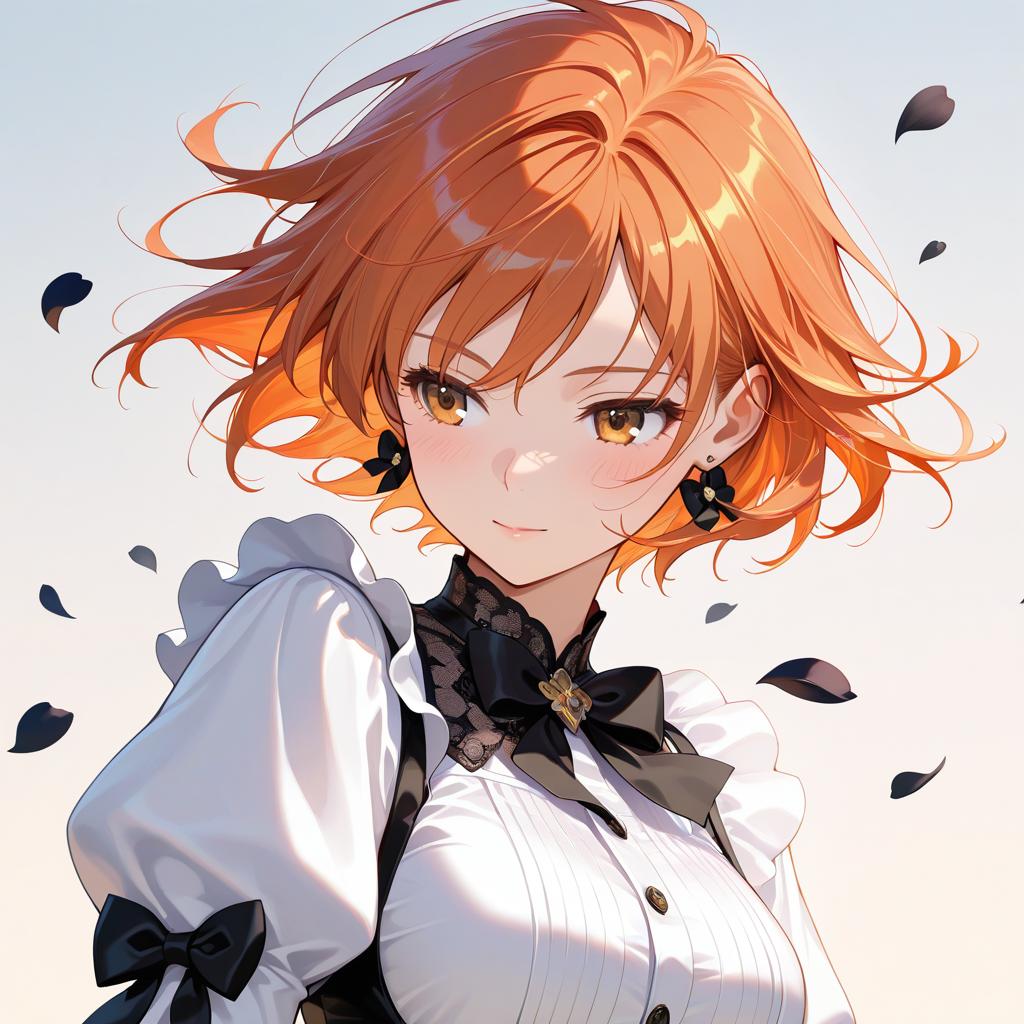 Absurdres, wallpaper, official_art, dappled sunlight, 1girl, sunlight, black bow, floating hair, orange hair, solo, puffy sleeves, black flower, short hair, gradient background, falling petals, bow, flower earrings, petals
