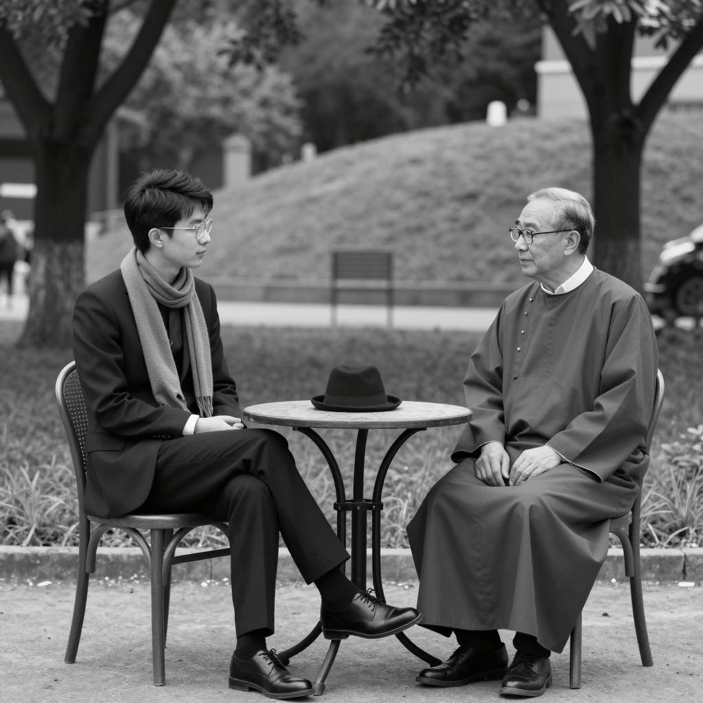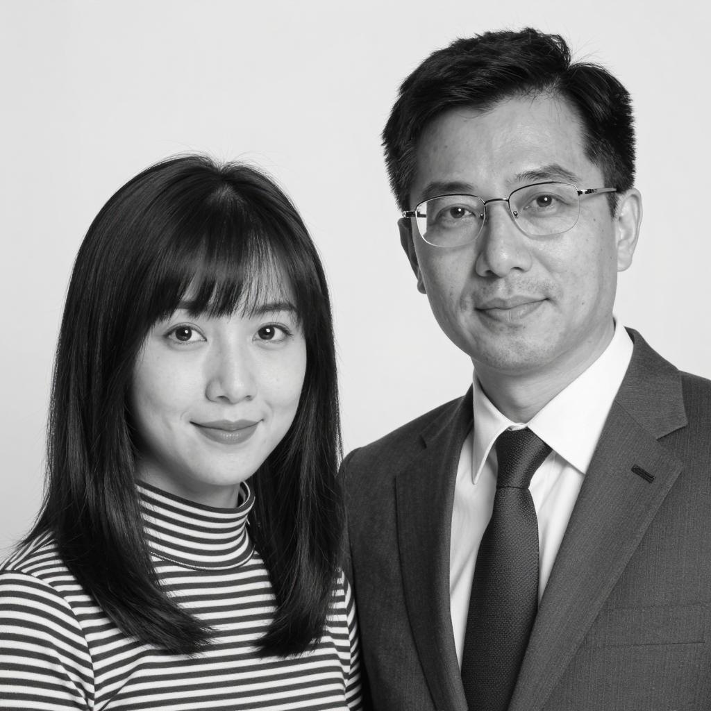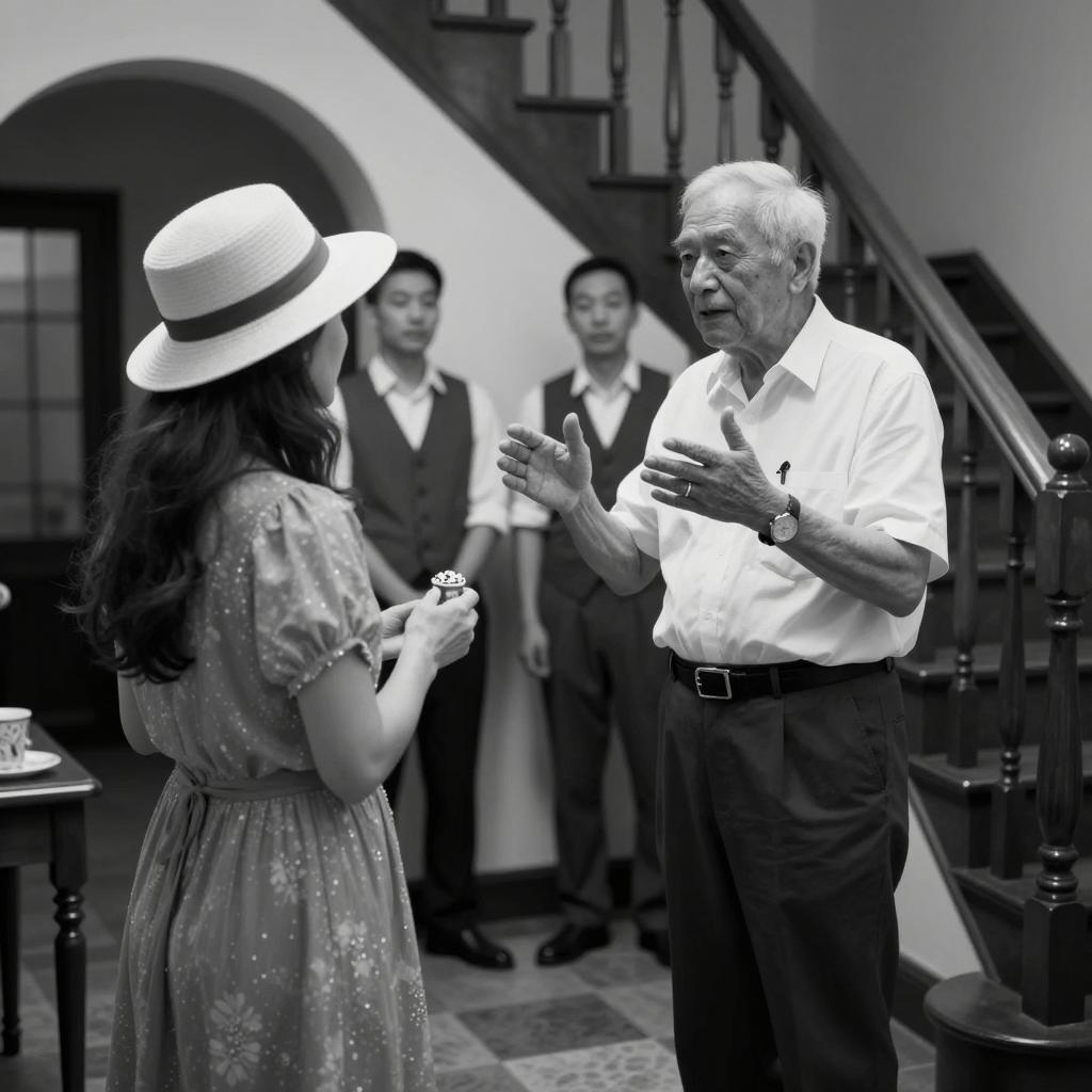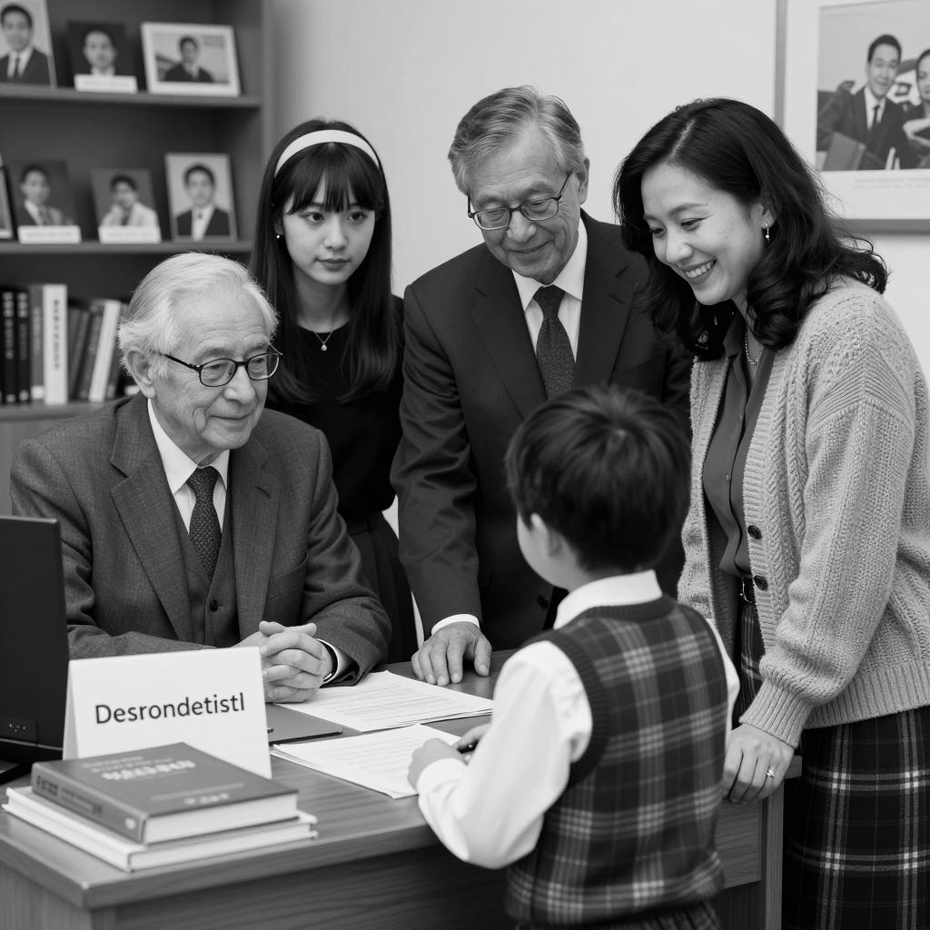 Black and white photo of a middle-aged man wearing glasses, a dark suit, white shirt, and tie standing front center while speaking. Behind him are Asian students dressed in white shirts and dark vests or dresses holding musical instruments such as a drum and flute. A banner reading 'GOOD LUCK Class of 1965' hangs above against a dark curtain background. The group appears formal and focused.