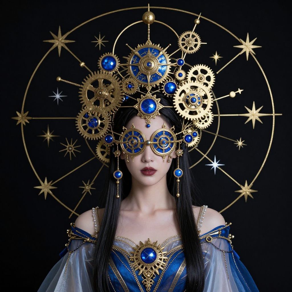 The image depicts a gothic woman adorned in an elaborate, star chart-inspired headpiece that combines elements of arcane and futuristic design. The headpiece is a complex assembly of golden and blue components, including intricate gears, spheres, and filigree, creating a sense of depth and dimension. The woman's face is partially obscured by the headpiece, adding an air of mystery. Her attire is equally detailed, with a flowing, ethereal garment that features a mix of blue and white hues, complementing the headpiece's color scheme. The background is dark, allowing the vibrant colors of the headpiece and garment to stand out prominently. The overall composition is balanced, with the headpiece and garment occupying the central focus, while the star charts and gears add a layer of complexity and depth to the scene. The image is a blend of traditional and modern elements, creating a unique and captivating visual experience.